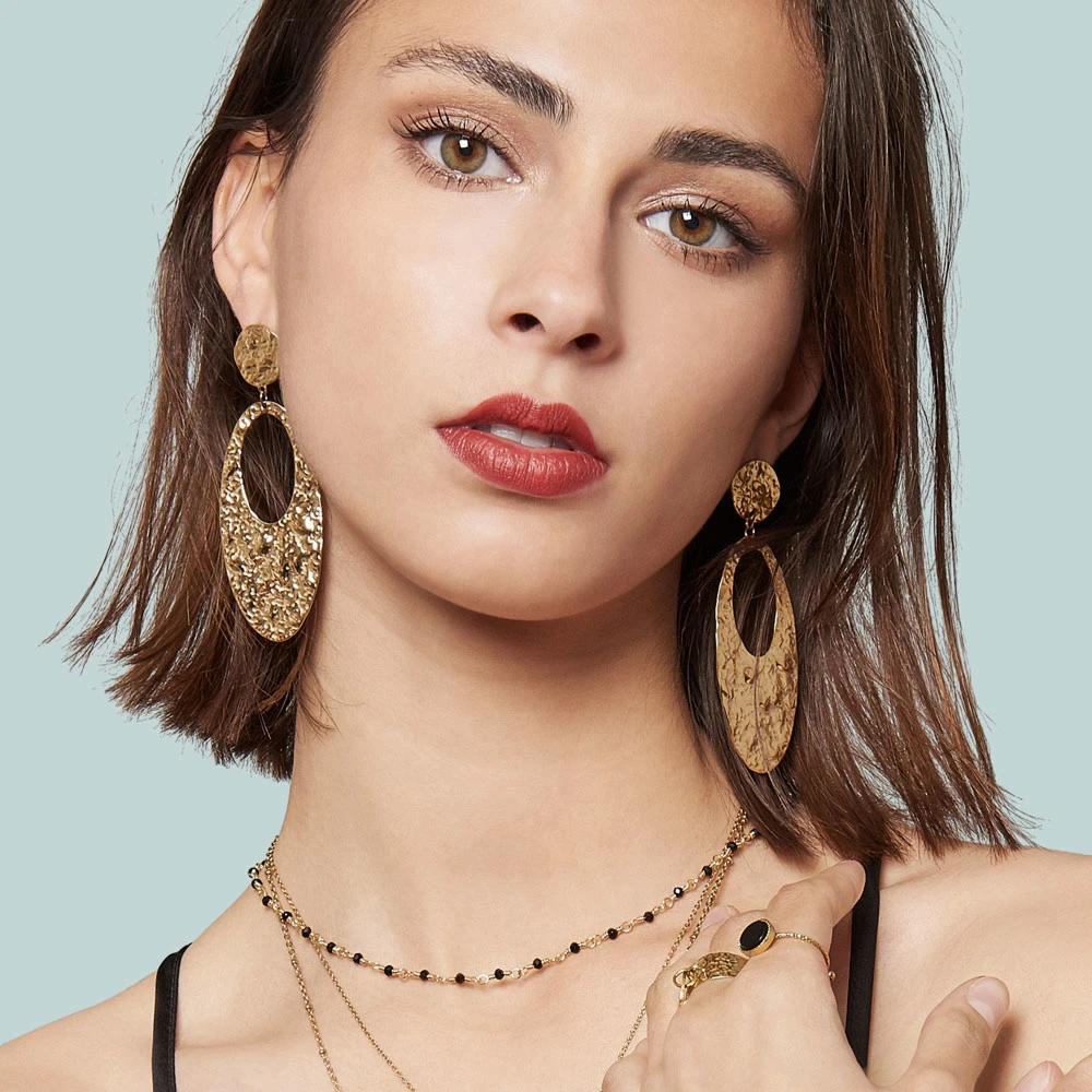 Boucles longues en acier chirurgical trempé dans un bain doré et signées Siloé.