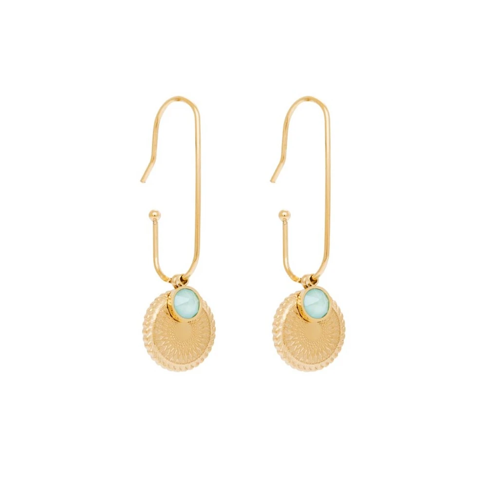 Ces boucles d’oreilles longues en acier chirurgical trempé dans un bain doré signées Siloé Paris, sont composées d’une médaille avec rosace et d’un cristal bleu.