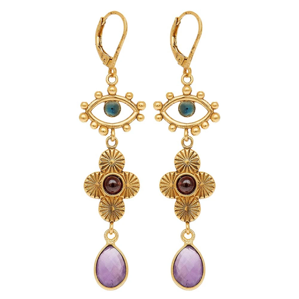 Boucles d’oreilles pendentif oeil et de trèfle sont ornés d’un pendant en pierre d’améthyste qui vient parfaire le tout.