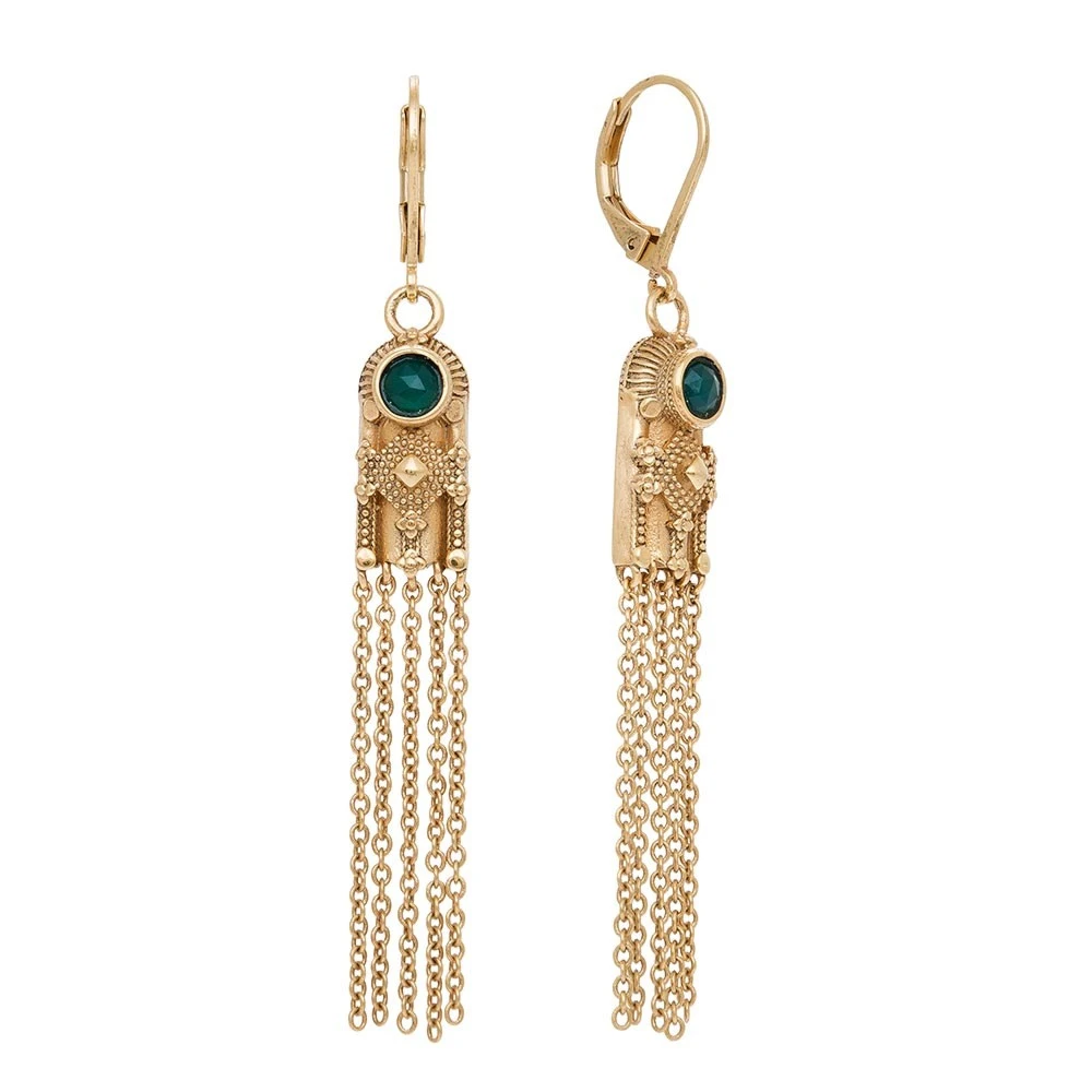 Boucles d’oreilles pendantes chaines ornées d’une pierre agate verte en plaqué or et signées LA2L.