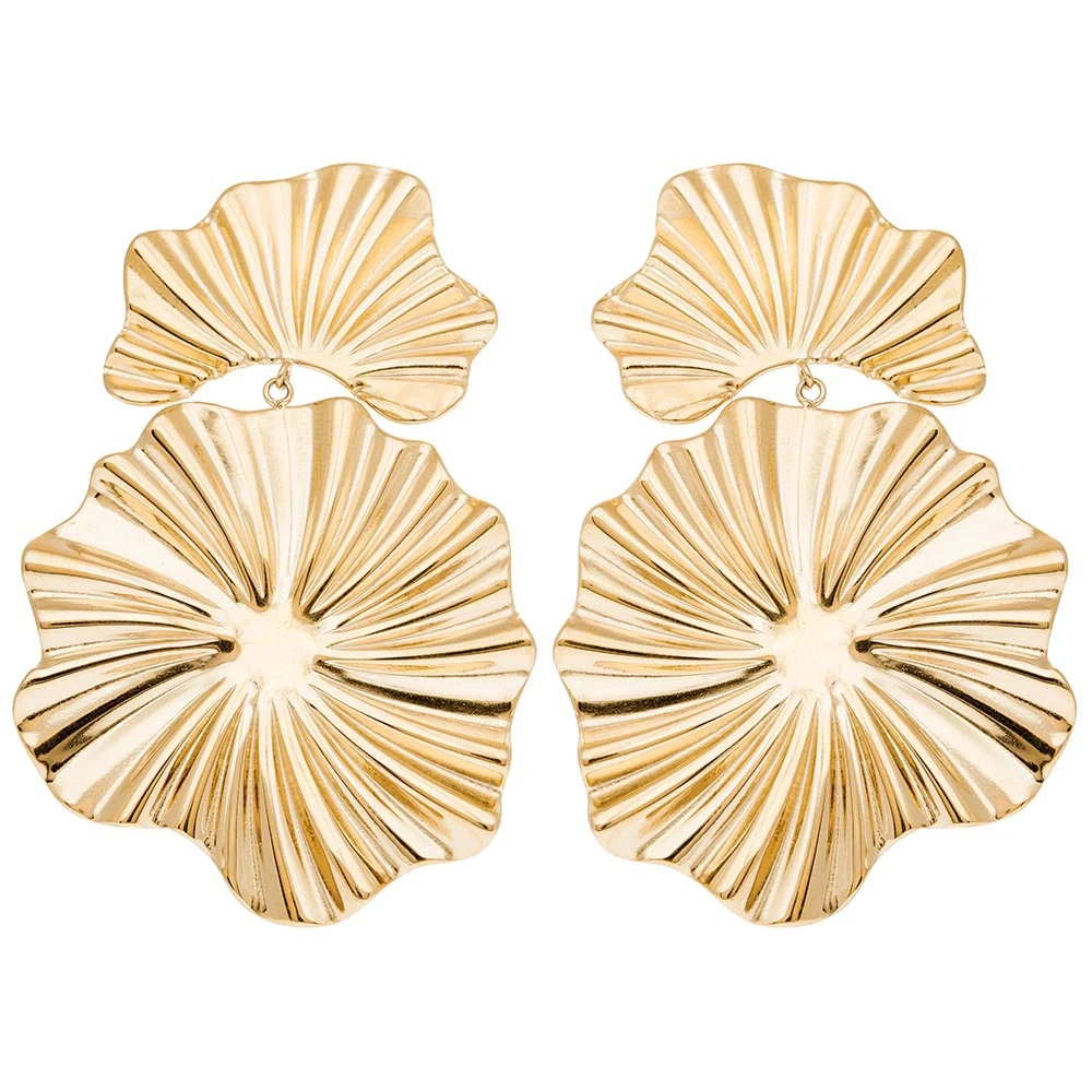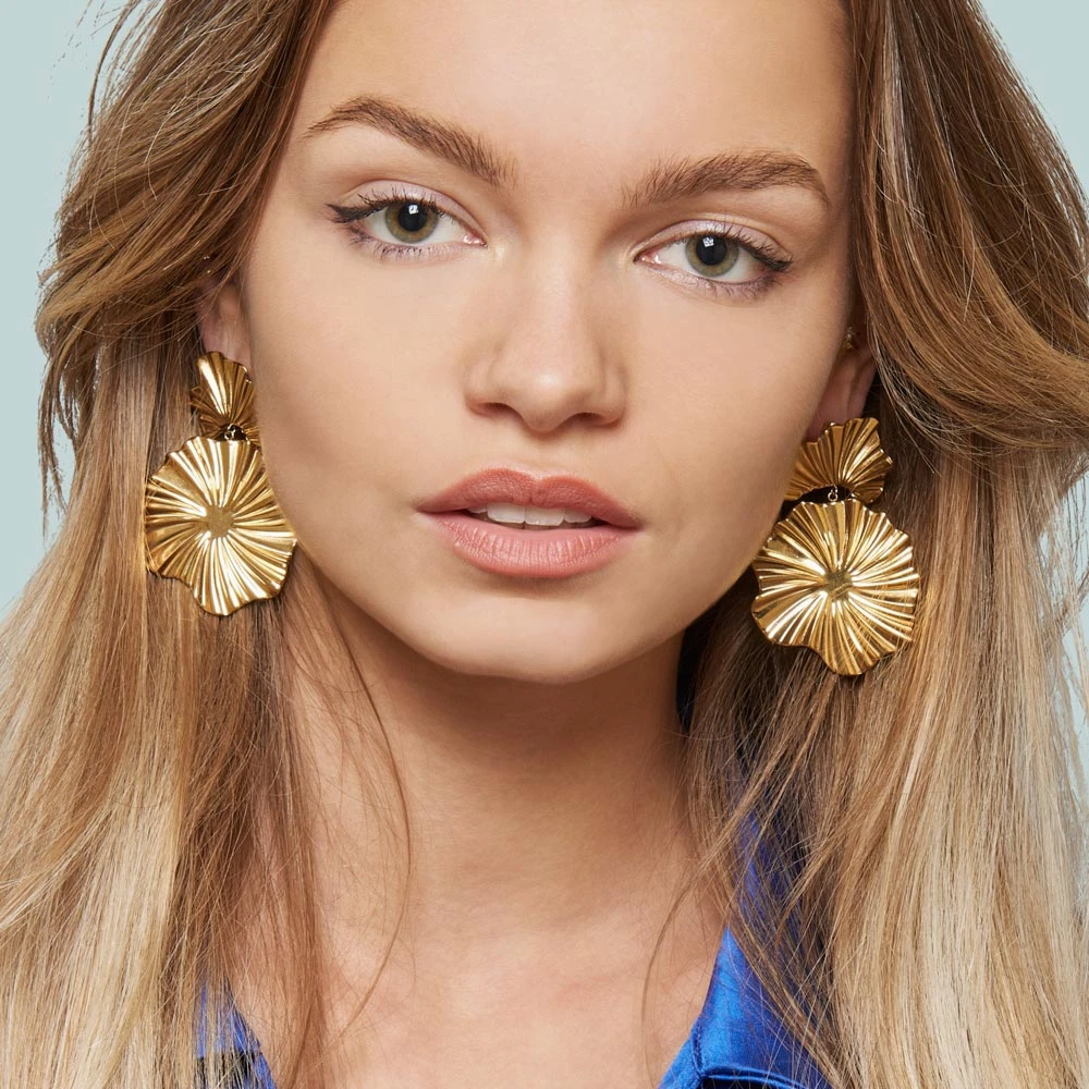 Boucles d’oreilles pendantes signées Siloé en acier inoxydable composées d’une demie médaille soleil et d’une grande médaille soleil.