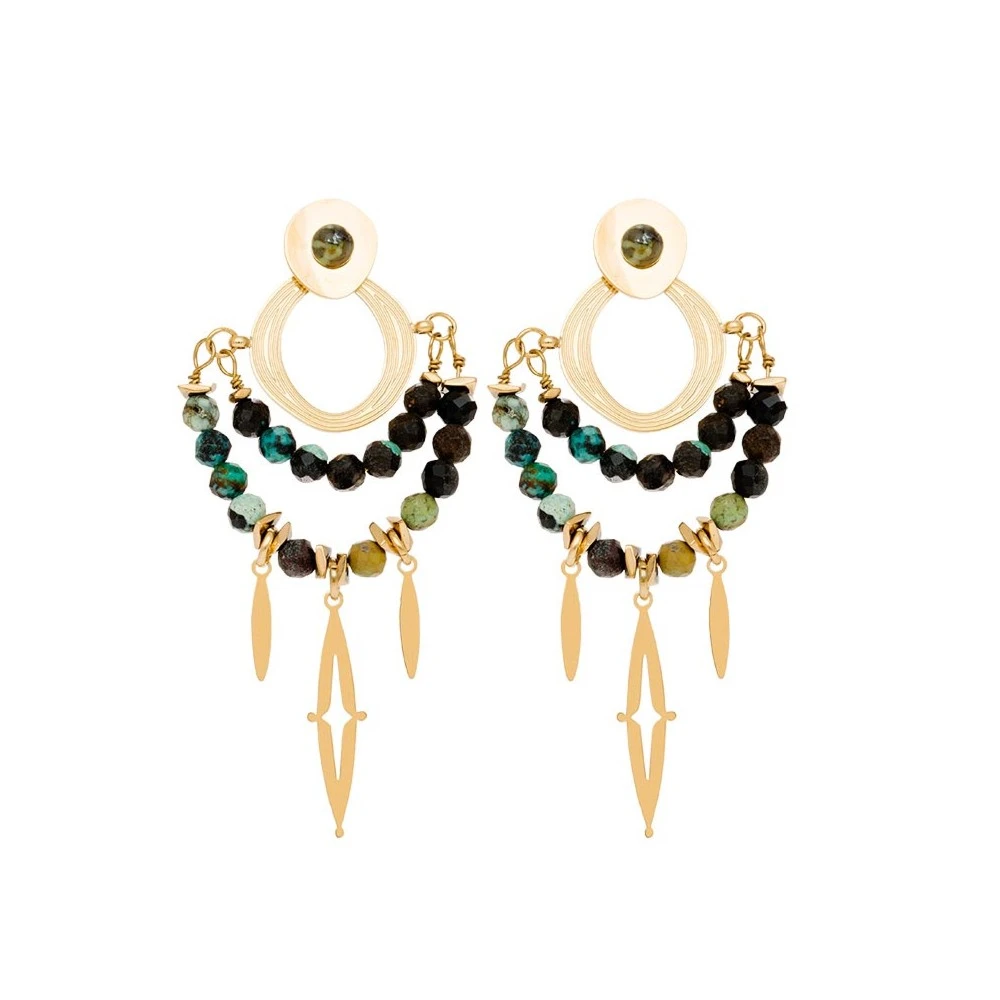 Ces boucles d’oreilles turquoise signées Siloé sont agrémentées de plusieurs breloques en losange.