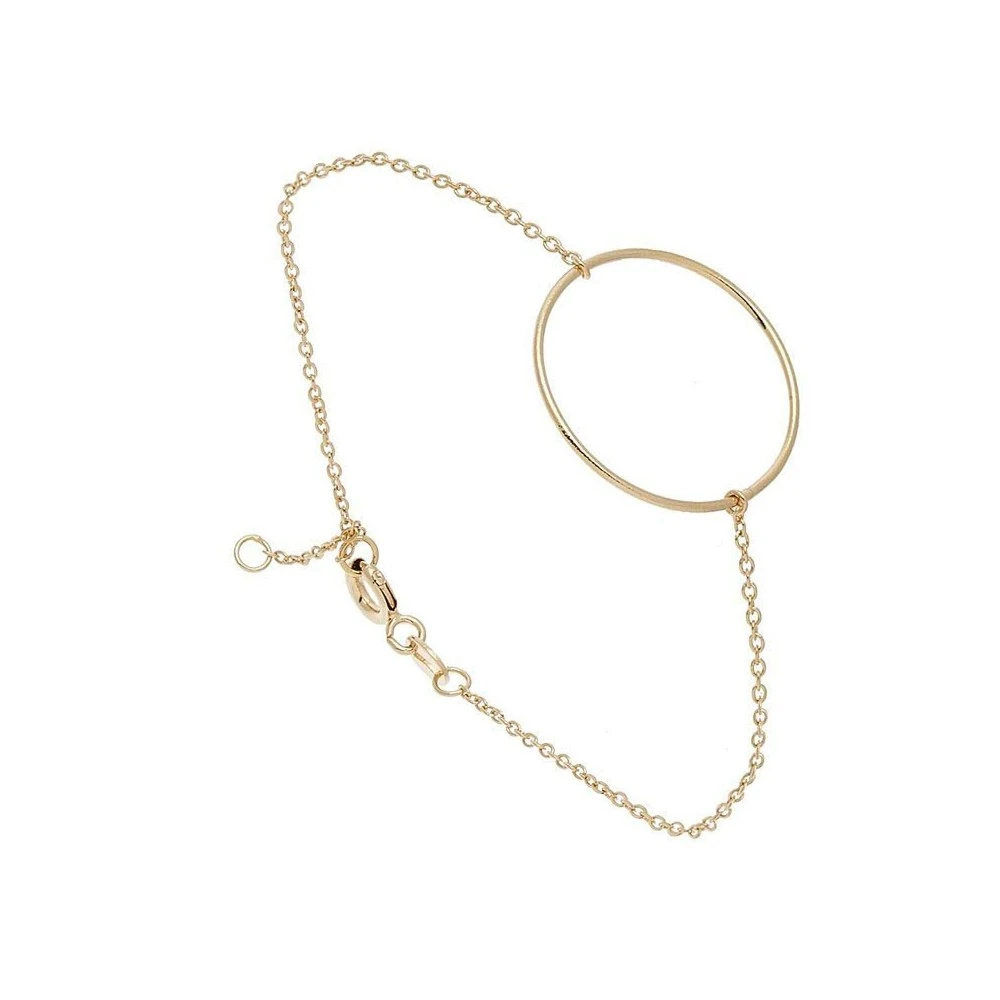 Ce bracelet est composé d’une fine chaîne en plaqué or reliée à un pendentif suspendu en forme d’anneau. Ce bijou habillera votre poignet avec délicatesse, idéal pour une tenue chic et minimaliste.