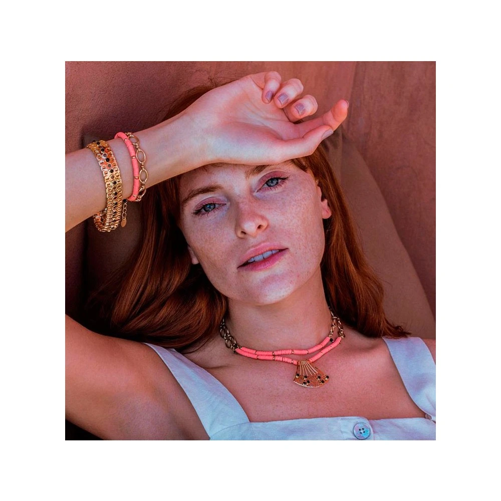 Ce bracelet de la collection Lagune signé Julie Sion est en laiton traité doré. Il est est orné d’une chaîne agrémenté de pastilles corail.