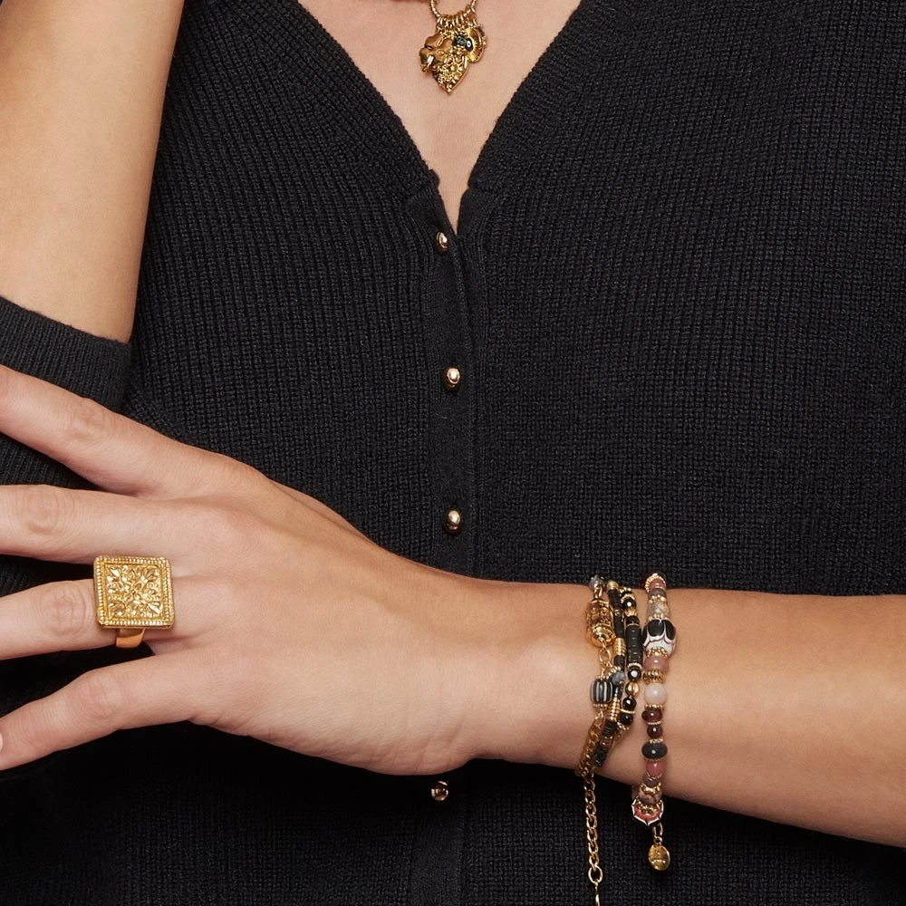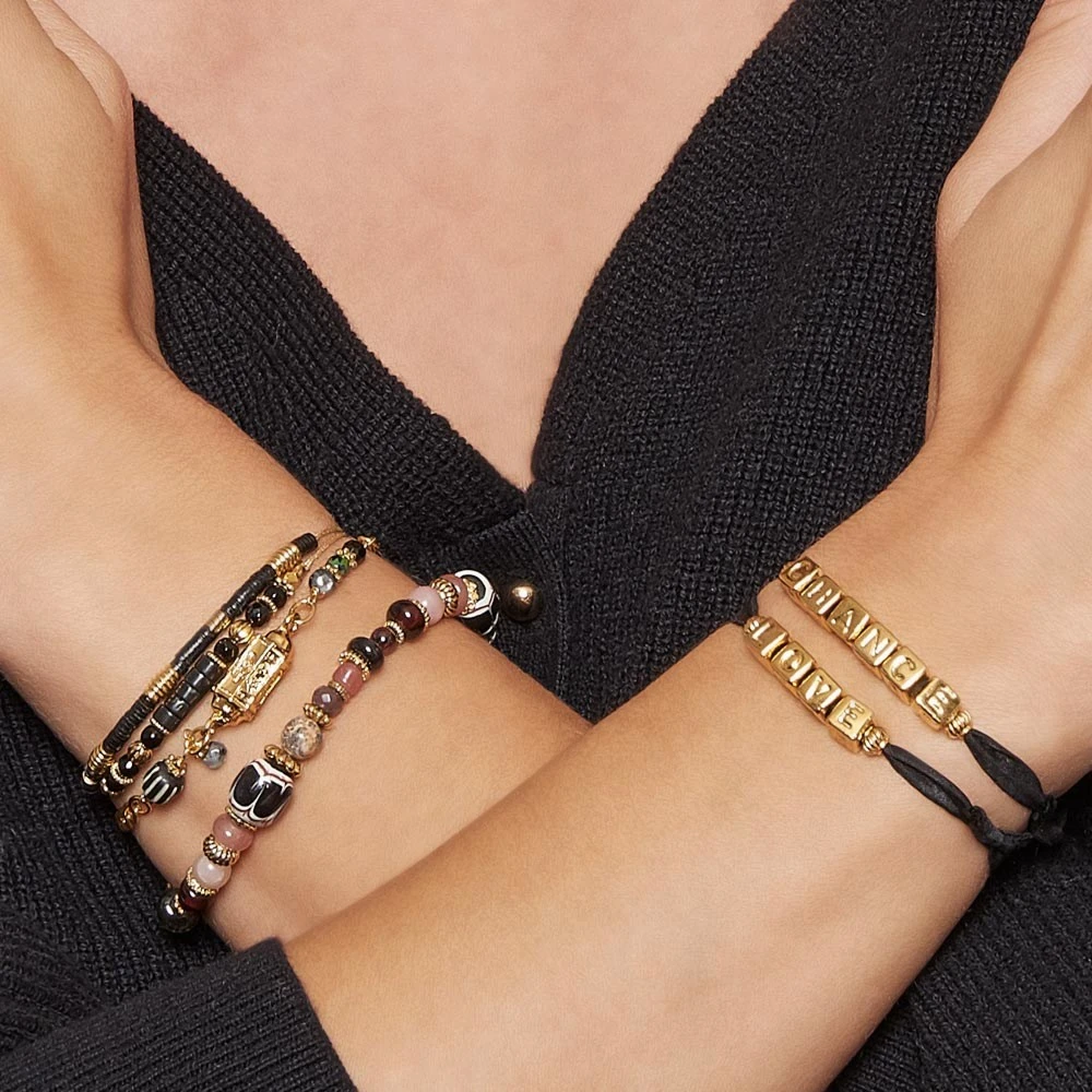 Bracelet élastique orné de pierres semi-précieuses et de perles vertes et rouges en laiton trempé dans un bain d’or signé By Garance.