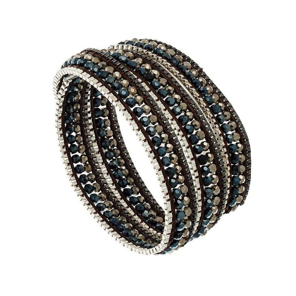 Ce bijou Nakamol très glitter se porte aussi bien en bracelet multi-tour façon manchette qu’en bijou de tête. Une double rangée de cristaux couleur hématite et pyrite est montée sur un lien de cuir chocolat et encadrée d’une chaîne argentée d’un côté et d’une autre couleur gun de l’autre.