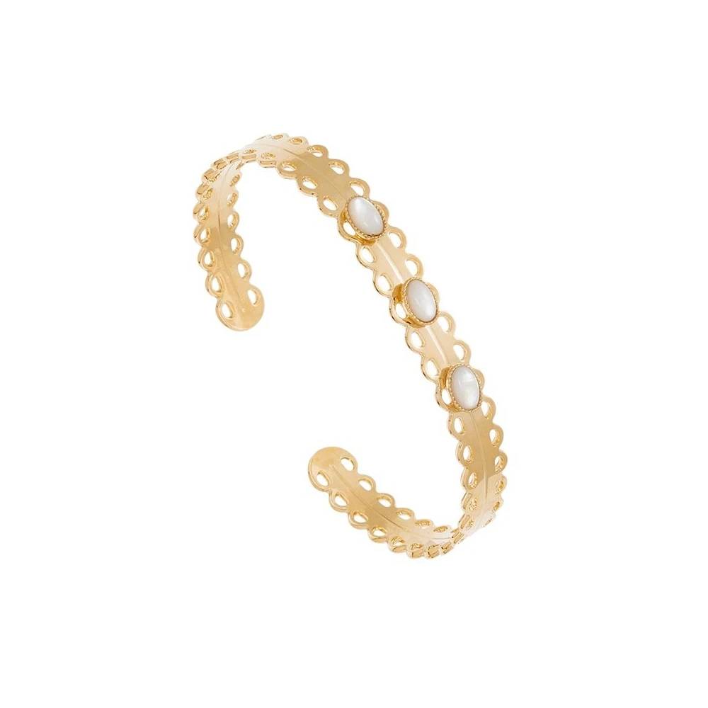 Bracelet jonc en laiton trempé dans un bain d’or, signé Aurélie Joliff. Le bracelet est ajouré et composé d’un trio de pierres en nacre.