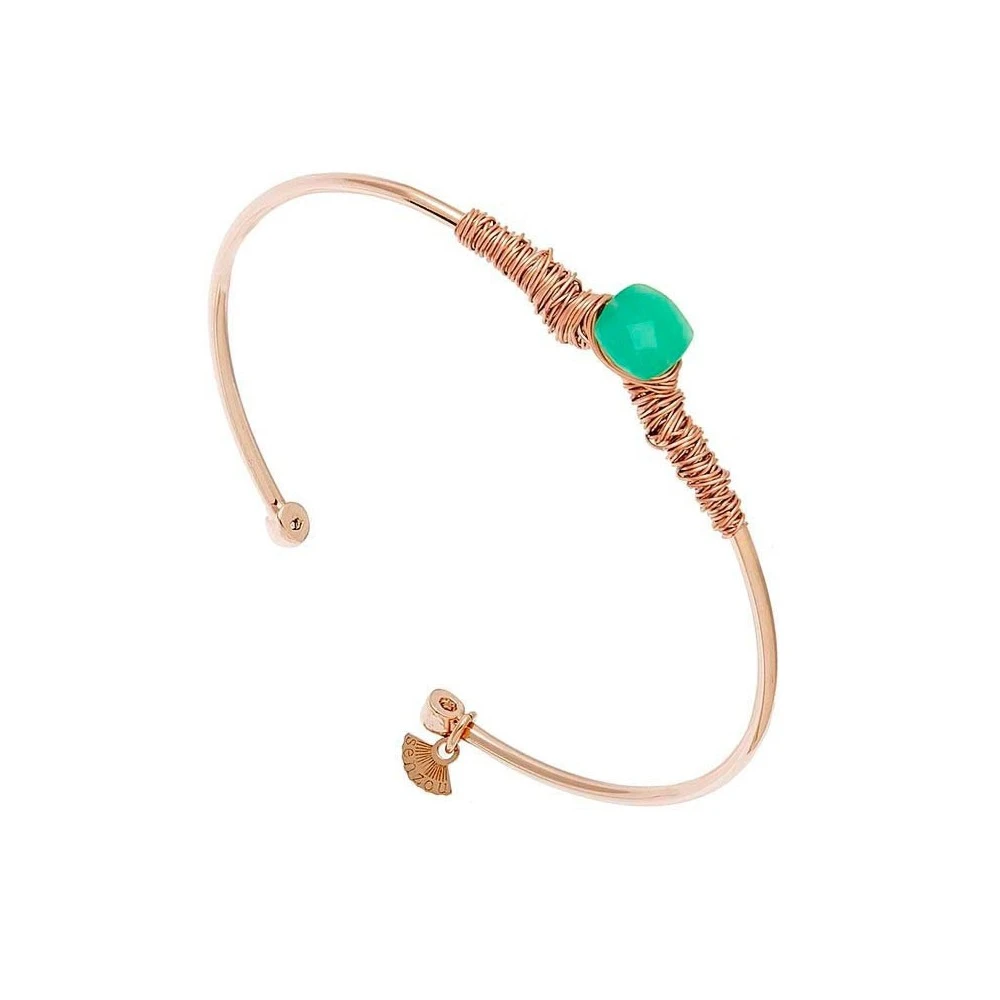 Senzou vous présente le jonc Briolette en plaqué or 3 microns. En son centre, une pierre de chrysopraze entourée de fils en plaqué or.