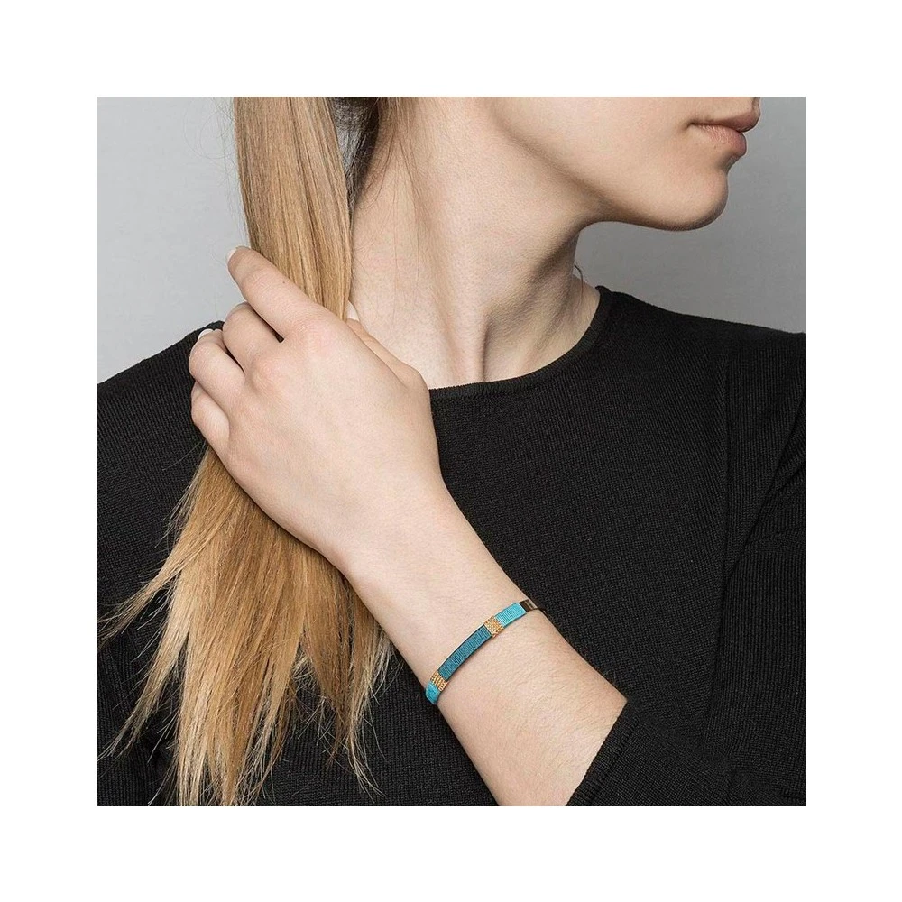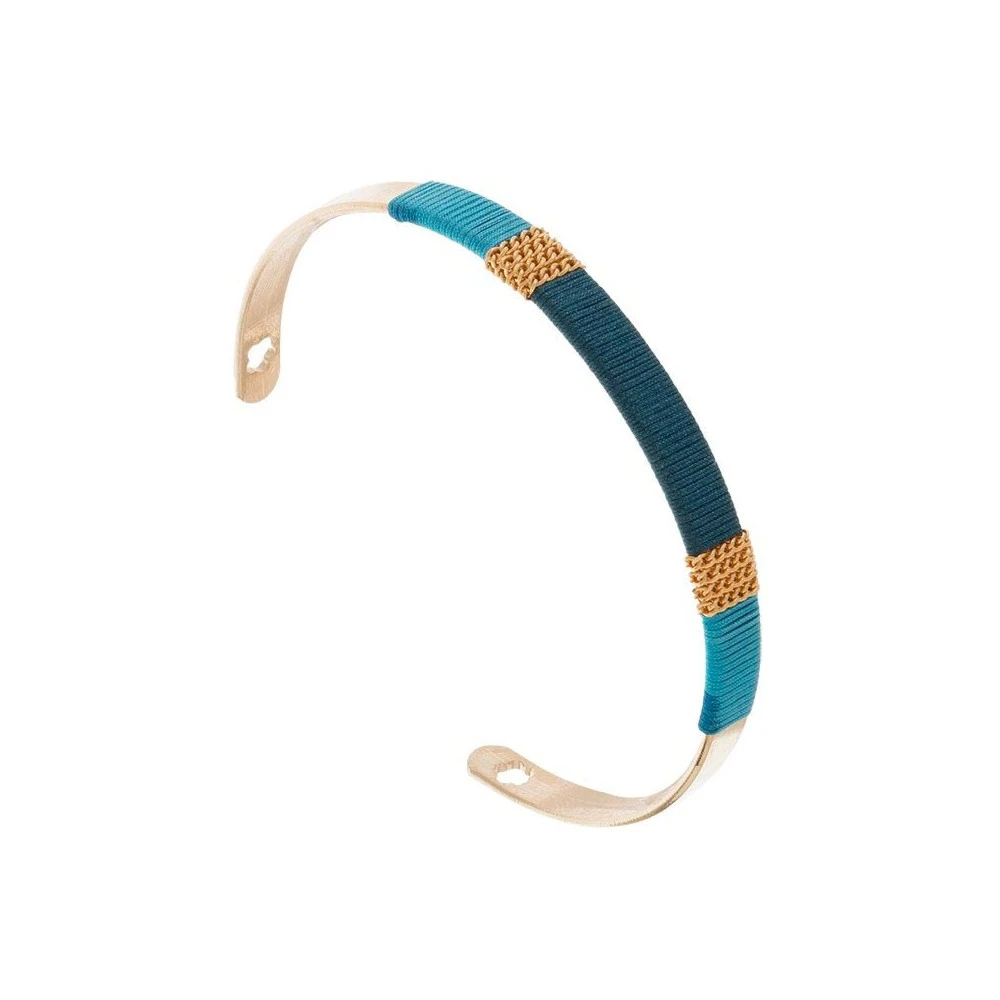 Bracelet jonc ethnique doré, signé By Jollia. Il est composé de petites chaînes dorées et d’une bande tissée avec des files bleu au centre du jonc.