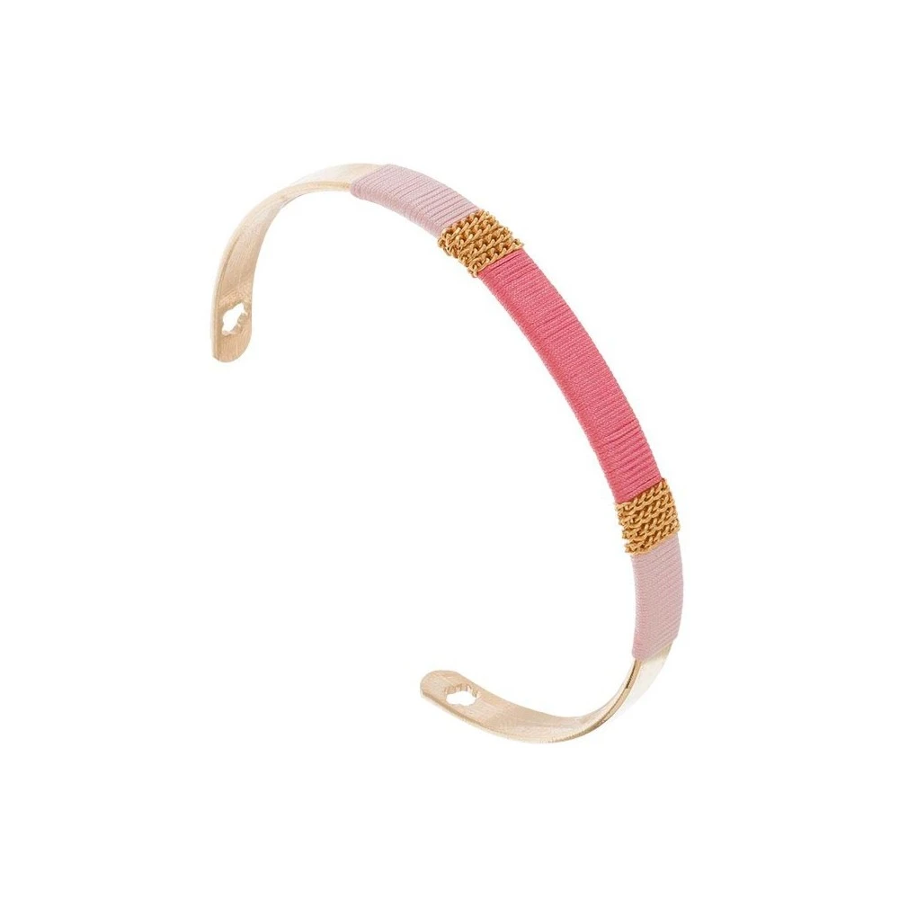 Bracelet jonc ethnique doré, signé By Jollia. Il est composé de petites chaînes dorées et d’une bande tissée avec des files rose au centre du jonc.