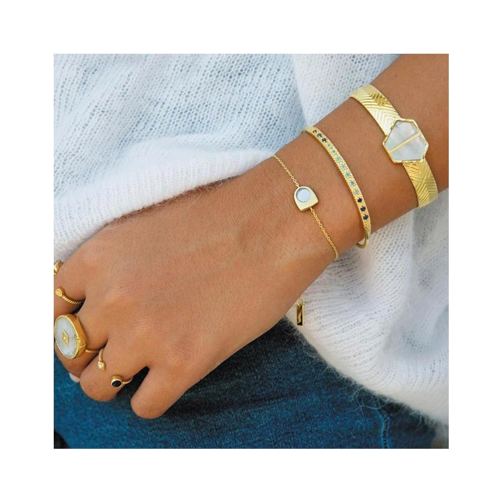 Ce jonc, signé Be Maad, est fabriqué à la main en laiton doré à l’or fin 18K et serti d’une pierre de lune en forme d’hexagone.