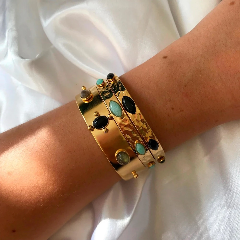 Ce bracelet jonc signé Les Folies d’Agnès en plaqué or est serti de 3 pierres semi-précieuses dont deux en labrodorite et celle du milieu en onyx.