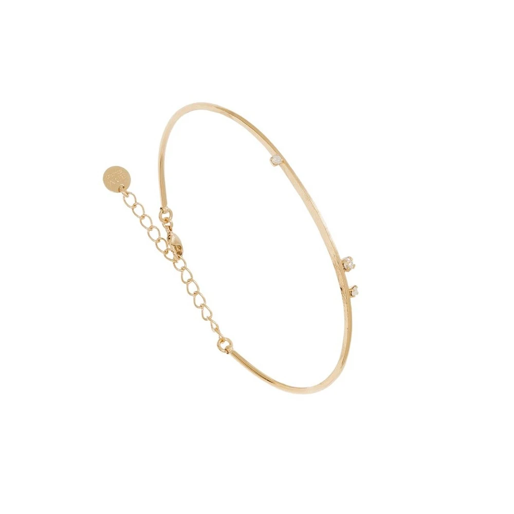 Ce bracelet jonc en plaqué or, composé de 2 strass Swarovsk blancs et d’une pierre en opaline, est signé BDM Studio.