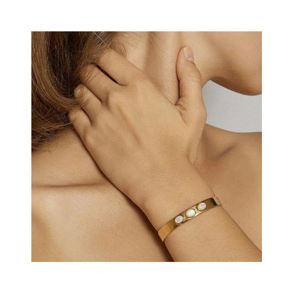 Bracelet jonc en plaqué or 3 microns 24 carats, signé Leticia Ponti, il composé de 3 pierres nacre.