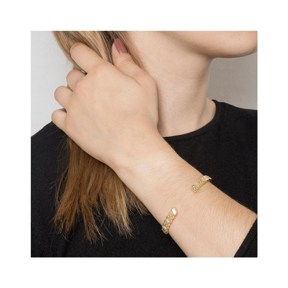 Ce jonc ouvert de la collection Mali est signĂ© Be Maad. Il est fabriquĂ© Ă la main en laiton dorĂ© Ă l’or fin 18K et serti de plusieurs pierres en nacre.