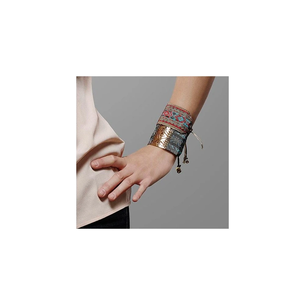 Bracelet manchette Arlequin en plaqué argent, composé d’une plaque ajourée d’inspiration végétale délicatement recouverte de métal doré, et d’un motif géométrique dessiné par des perles de rocaille aux tons turquoises et marrons. Facile à assortir et à porter en toutes occasions, ce bijou est une création originale de la gamme de bracelets Mishky. Ce bracelet est réglable et s’adapte à tous les poignets ! Les cordons de réglage sont ornées de jolies pierres turquoises, dorées et marrons.