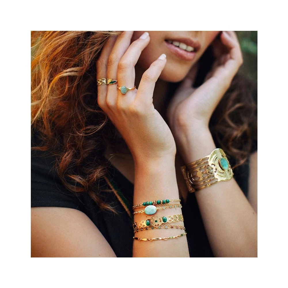 Ce bracelet manchette ajouré de la collection Inca, signé Laëti Trëma est en laiton trempé dans un bain d’or 24K et est composé d’une pierre semi-précieuse bleue, en amazonite.