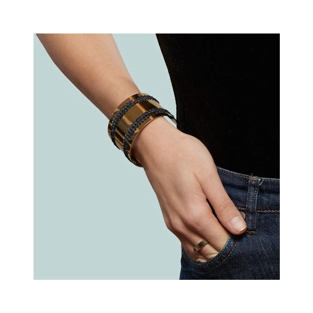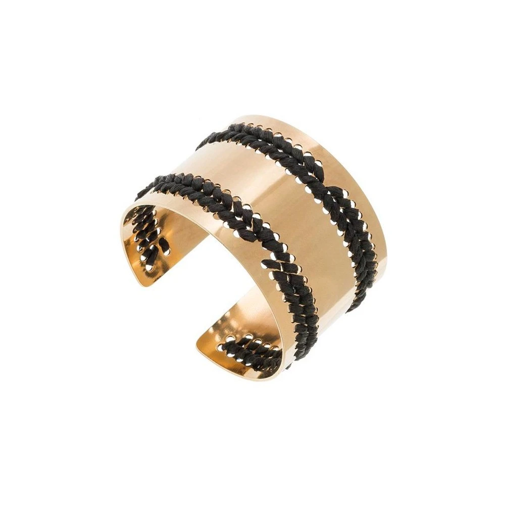 Ce bracelet manchette en laiton trempé dans un bain d’or 24K est signé Camille Enrico. Il est composé de fil de coton en couleur noir.