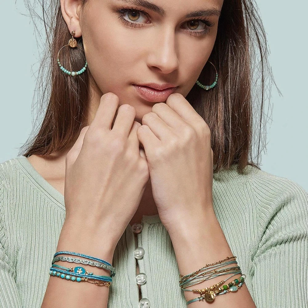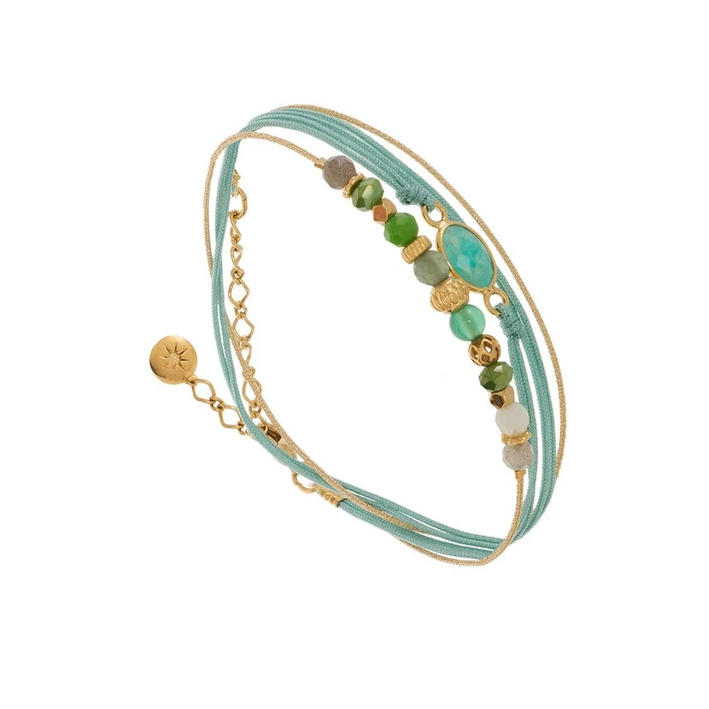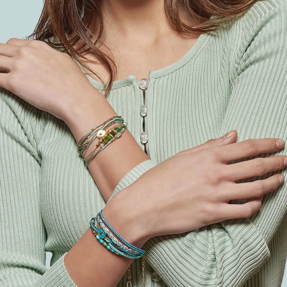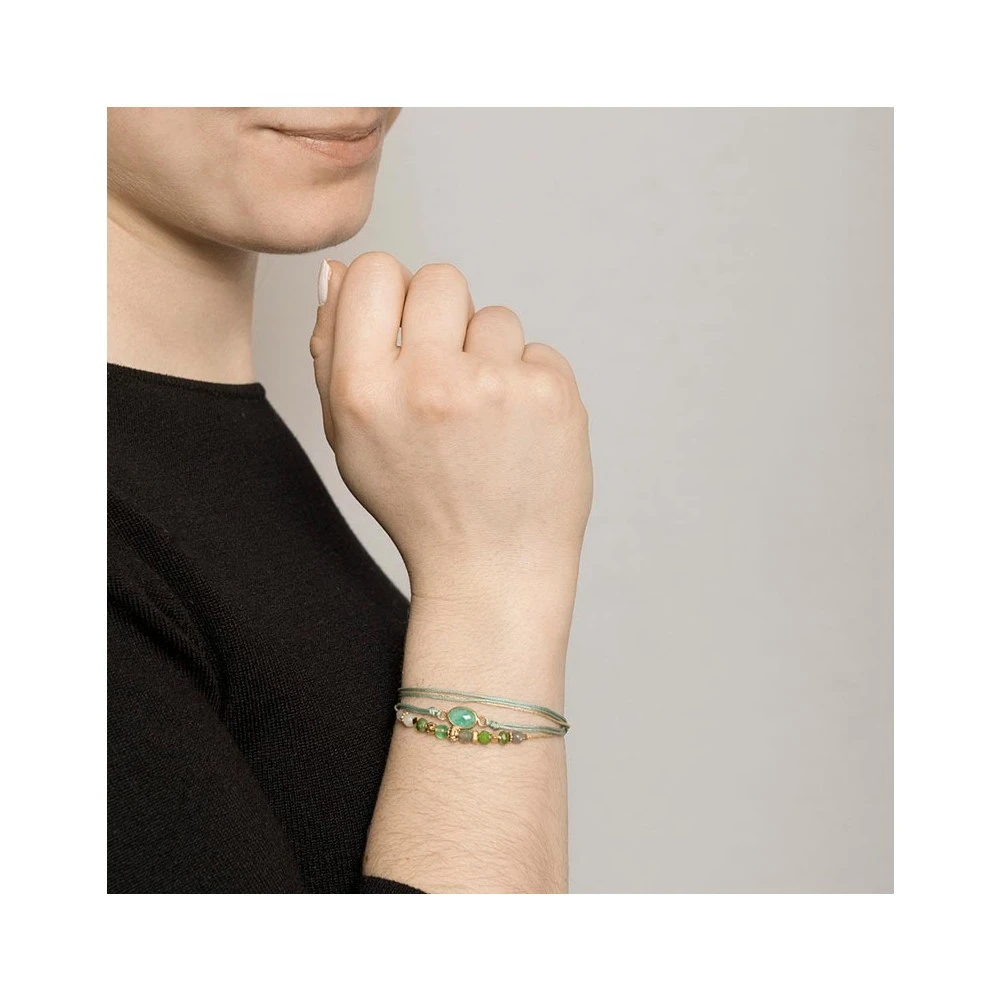 Bracelet 2 tours de la collection Micha signé By Garance. Il est en laiton trempé dans un bain d’or et est composé de pierres facettées vertes.