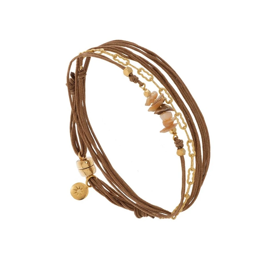 Bracelet de la collection Naïa signé By Garance. Il est en laiton trempé dans un bain d’or et composé d’une chaîne de maillons et sur l’autre, d’éclats de coquillages.