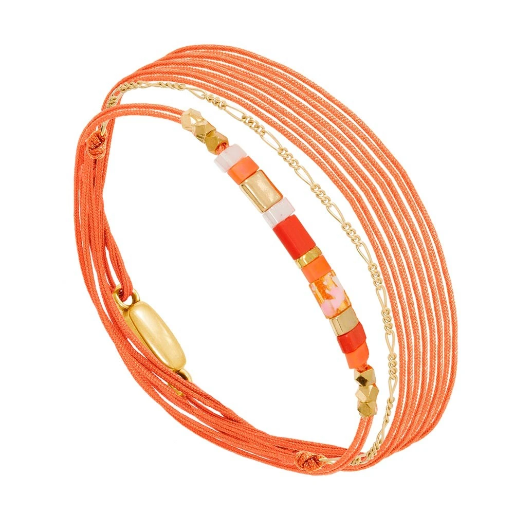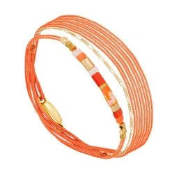 Bracelet multi-tours en laiton trempé dans un bain d’or signé By Garance composé de plusieurs cordons corail et de perles plates.