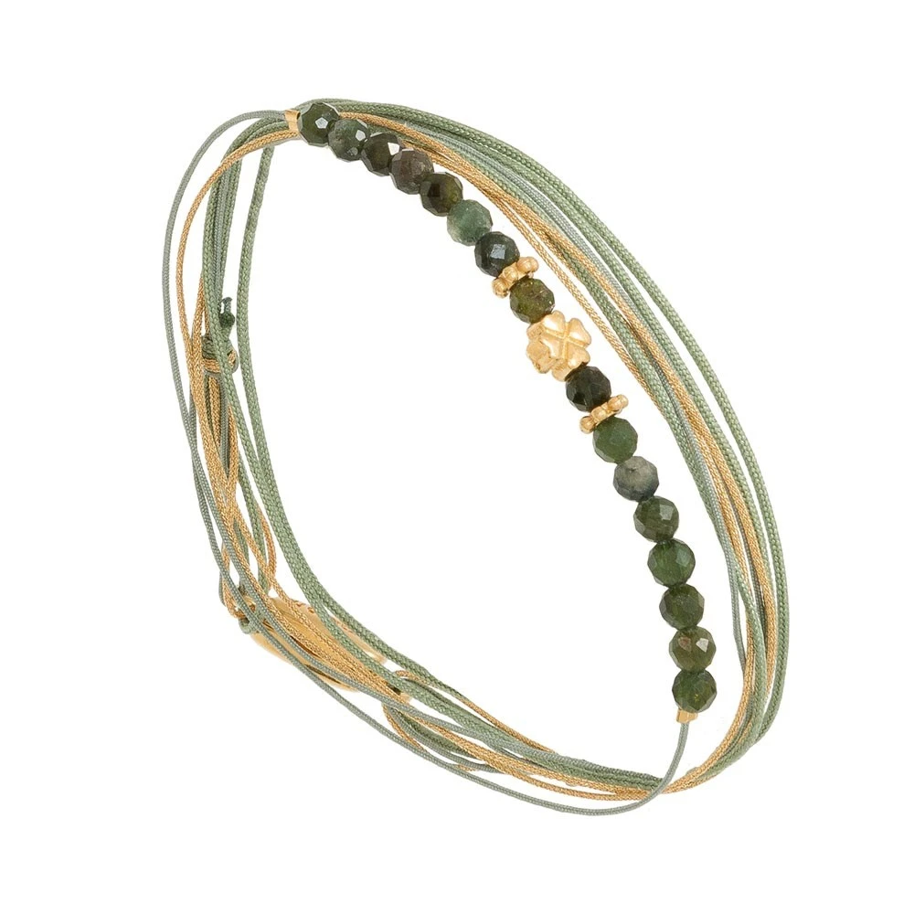Bracelet multi-tours orné de pierres semi-précieuses de couleur vert sauge tourmaline en laiton trempé dans un bain d’or signé By Garance.