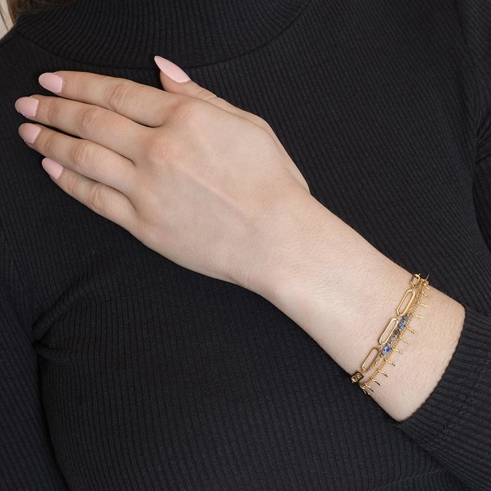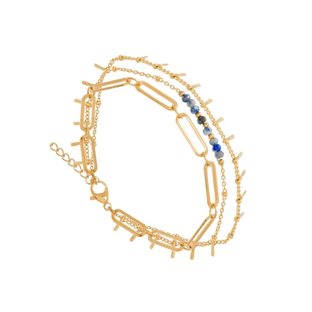 Bracelet Siloé triple rangs en acier chirurgical trempé dans un bain doré, composé d’une chaine avec pampilles, d’une seconde agrémentée de pierres en lapis et une troisième en maillons.
