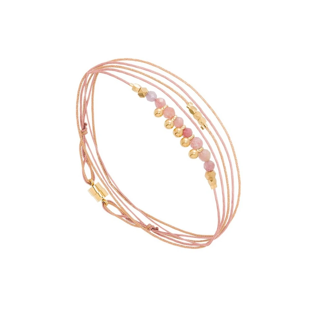 Bracelet multi-tours en laiton trempé dans un bain doré de la marque By Garance. Il est composé de plusieurs cordons roses, de billes dorés et de pierres en grenat.