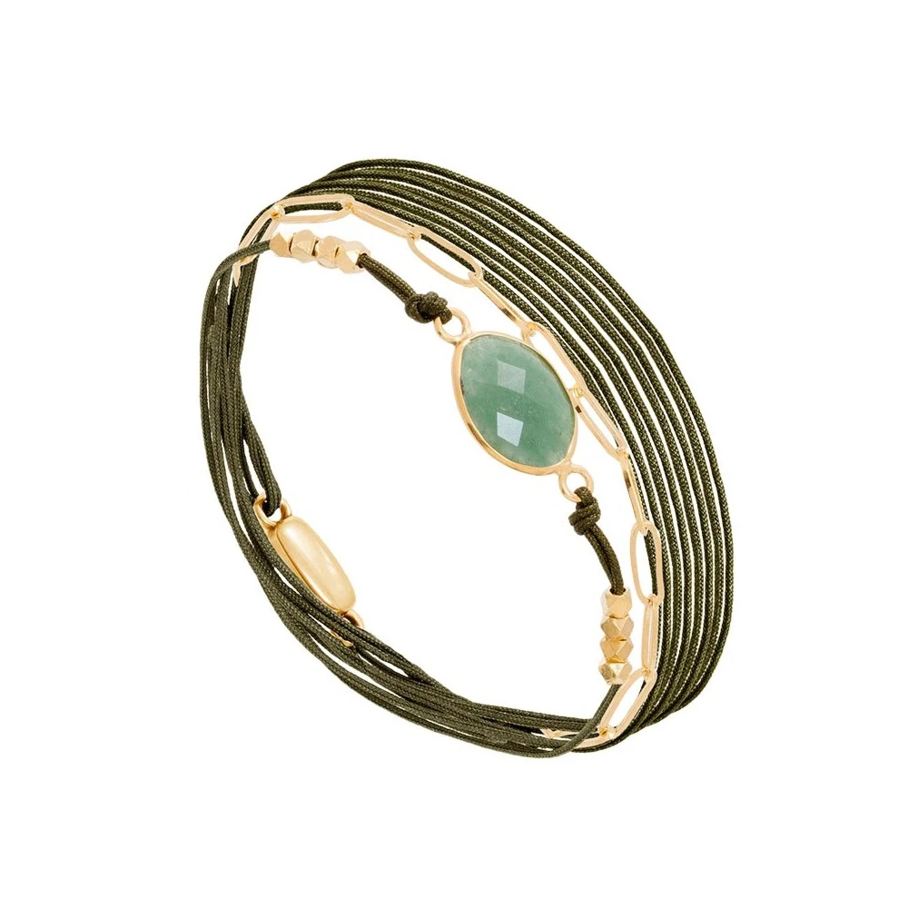 Bracelet multi-tours en laiton trempé dans un bain doré de la marque By Garance. Il est composé de plusieurs cordons kaki et de maillons dorés, et est agrémenté d’une pierre facettée en aventurine.