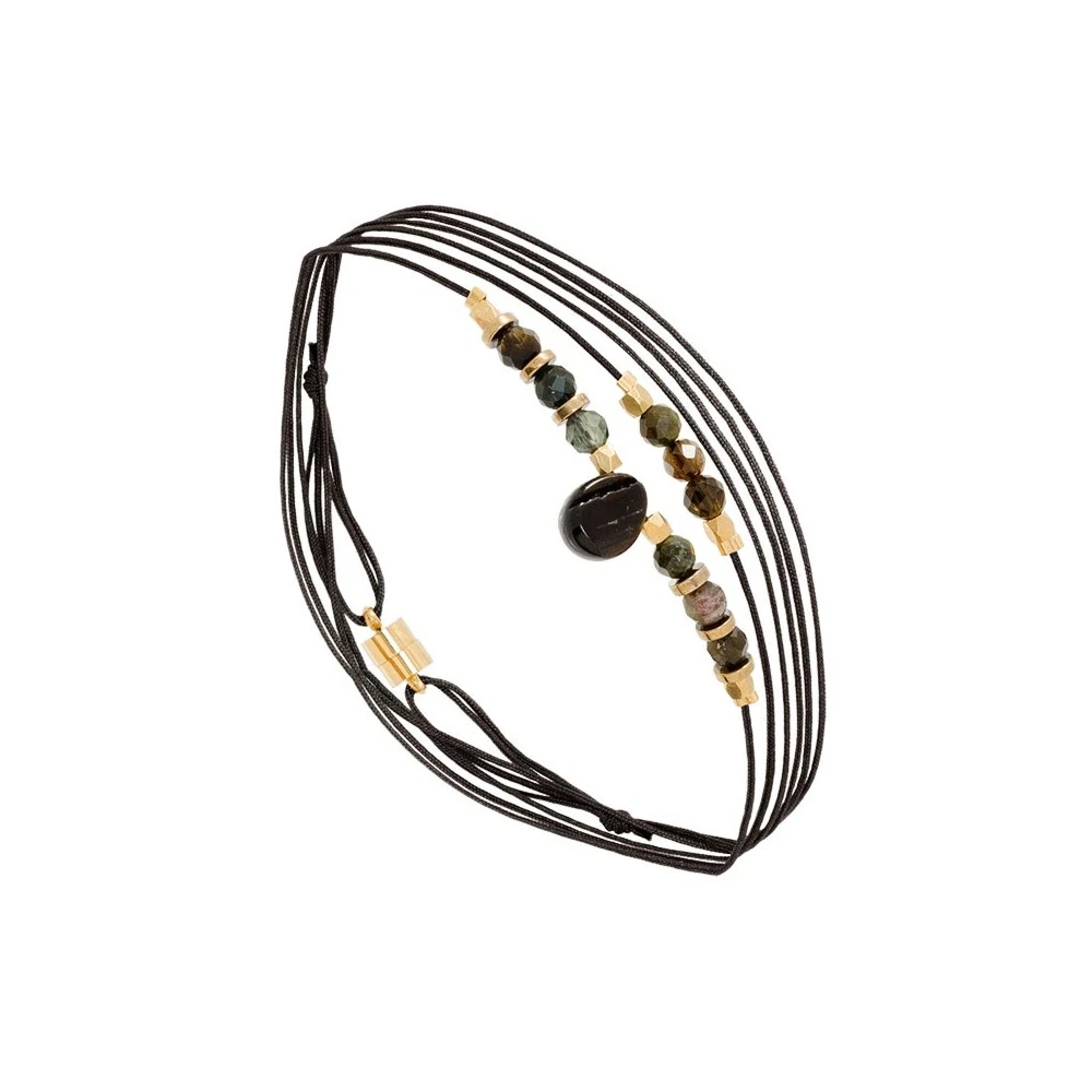 Bracelet multi-tours en laiton trempé dans un bain doré de la marque By Garance. Il est composé de plusieurs cordons noirs, de perles facettées et est agrémenté d’une pierre en tourmaline noire.