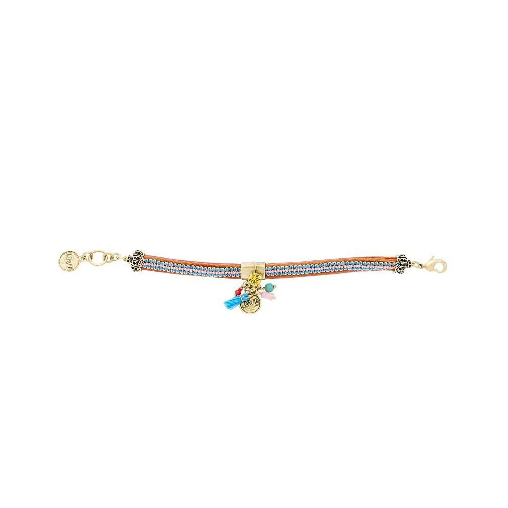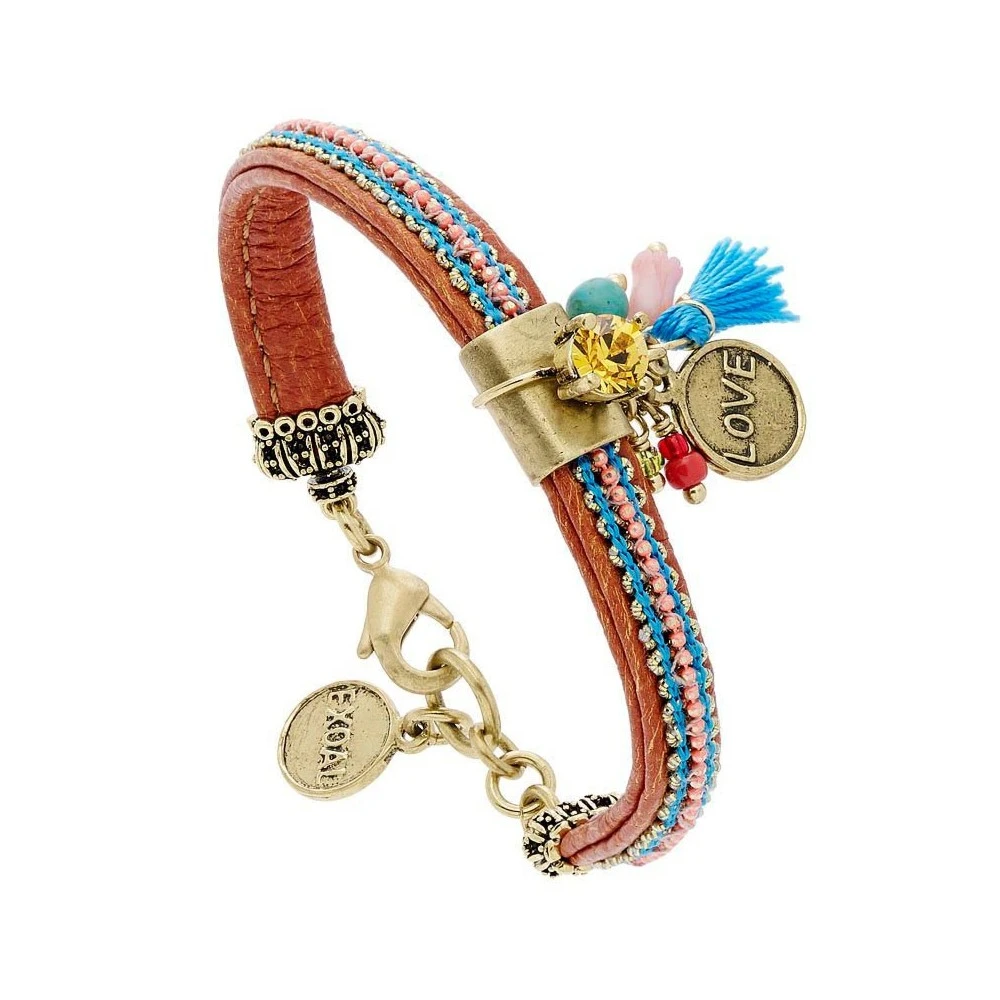 Le bracelet Nappa Exoal doré est en cuir souple teinté brun et habillé d’une dentelle colorée (bleu et corail). Il est orné en son centre d’une pierre et de petits charms colorés. Adoptez ce bijou fantaisie pour rehausser votre tenue quotidienne.