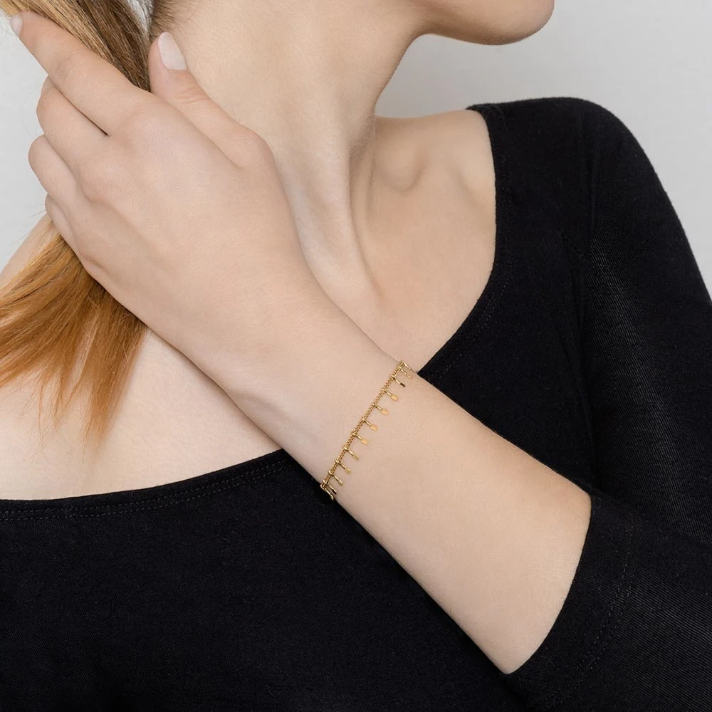 Bracelet fin en acier chirurgical trempé dans un bain doré, signé Siloé, composé de pampilles dorées.