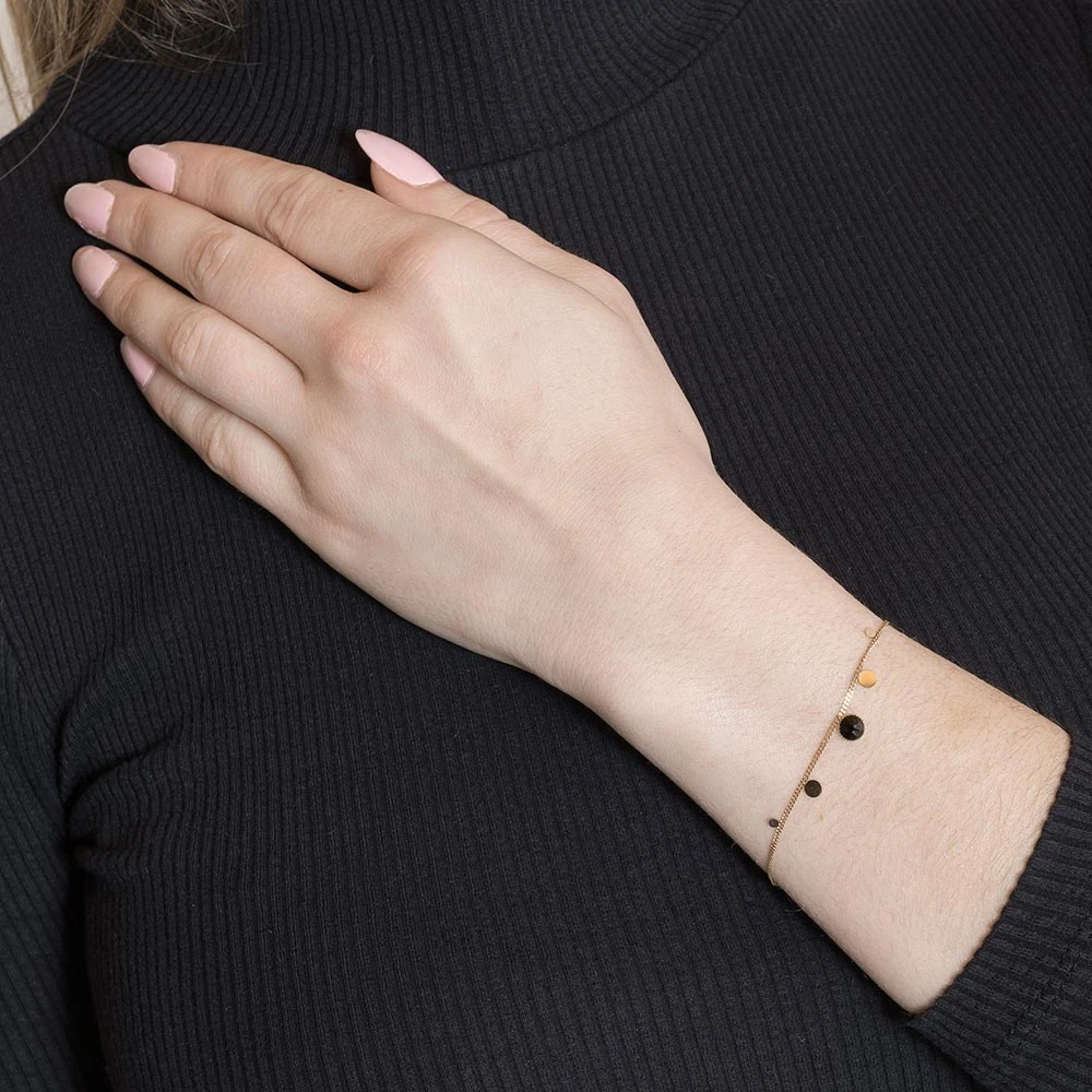 Bracelet fin en acier chirurgical trempé dans un bain doré, agrémenté de pastilles irrégulières et d’un cristal noir. Il est signé Siloé Paris.
