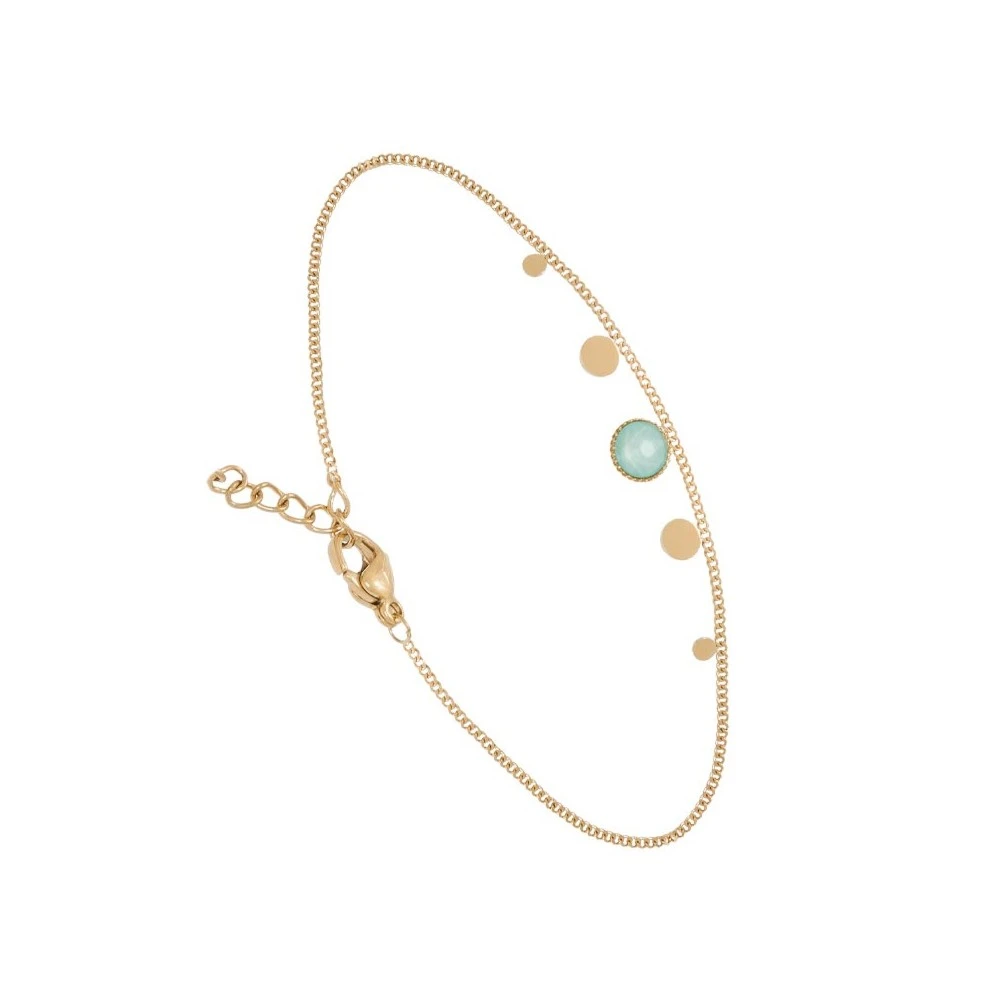 Bracelet fin en acier chirurgical trempé dans un bain doré, agrémenté de pastilles irrégulières et d’un cristal vert. Il est signé Siloé Paris.
