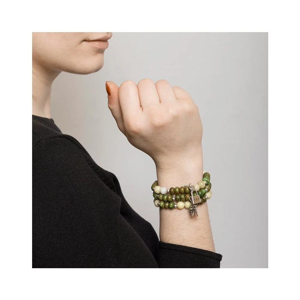 Bracelet semainier signé Shabada, composé de 3 bracelets en pierres naturelles vertes, reliés par une barre ornée de breloques argentées.
