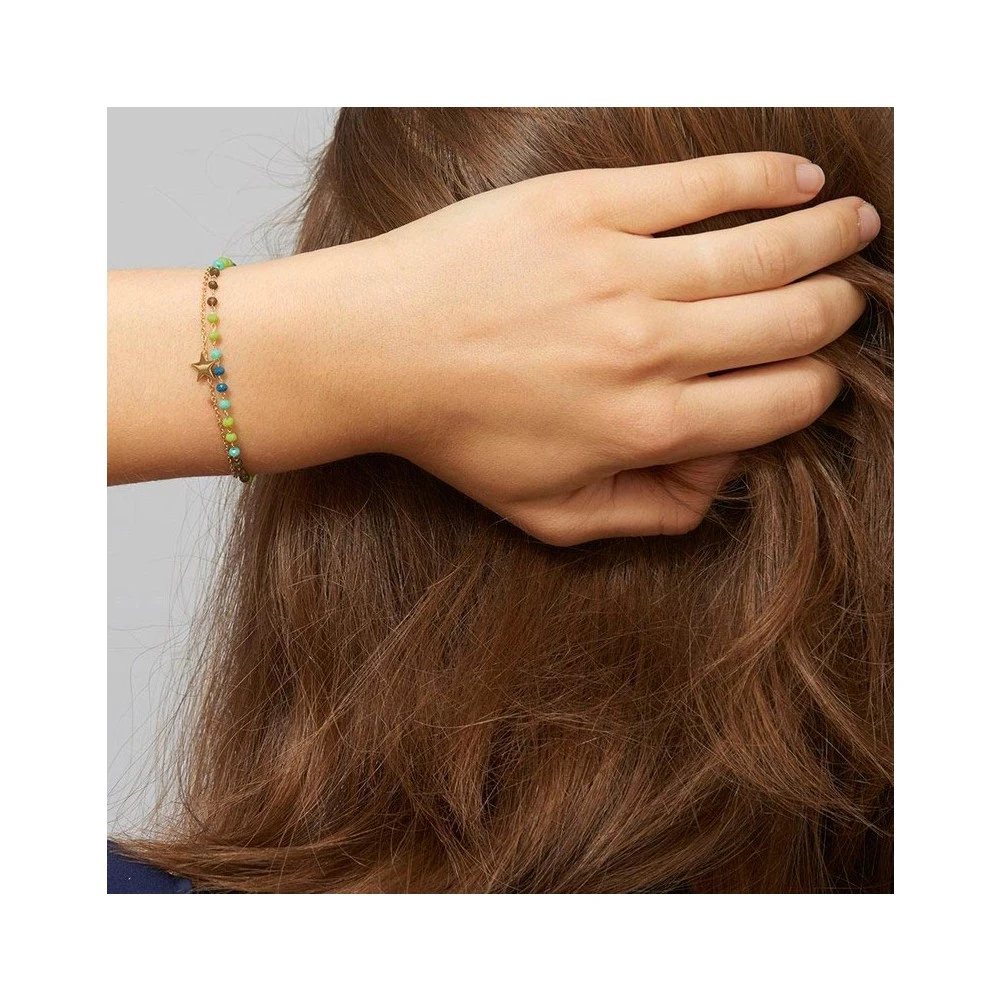 Bracelet Starmania en acier chirurgical doré, composé de petites perles facettées bleu et vert et d’un mini pendentif étoile de la marque Zag Bijoux. Ce bracelet discret et fin habillera votre poignet en beauté.