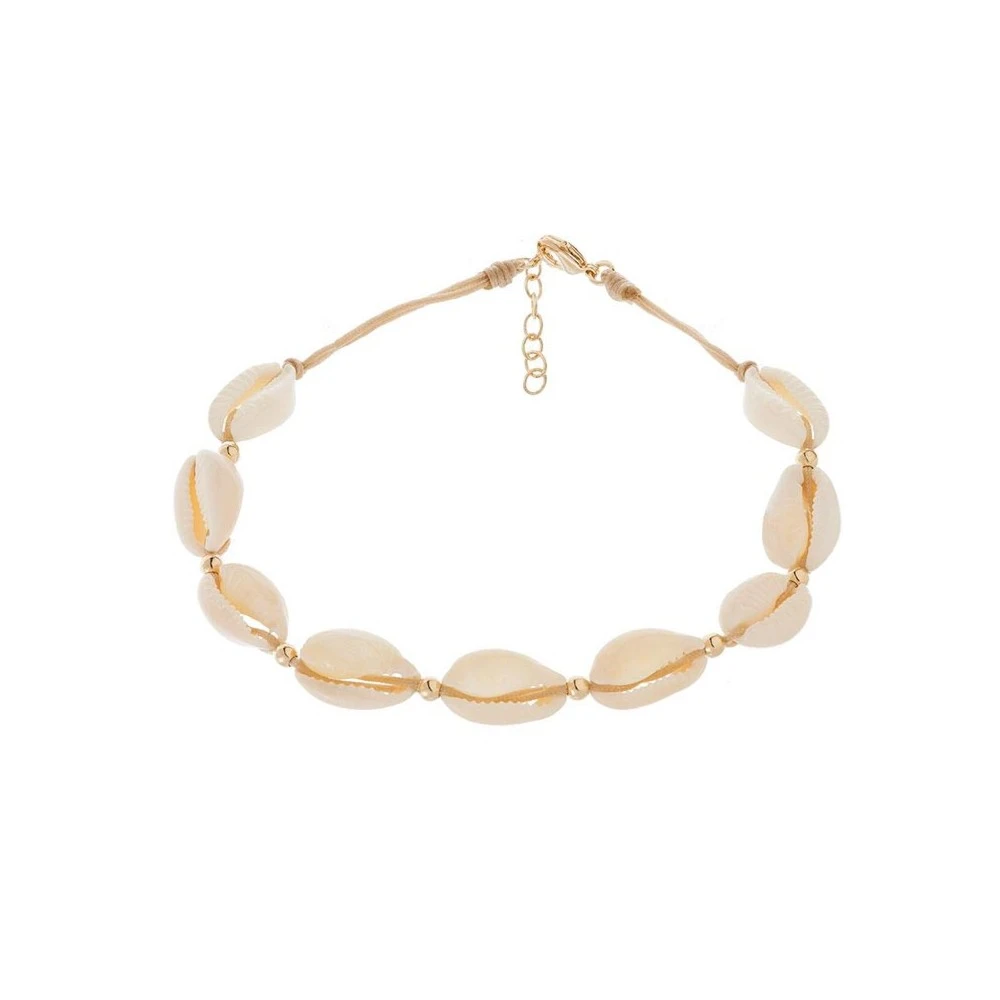 Bracelet chaine de cheville composé de coquillages véritables et de billes. Finition en plaqué or.