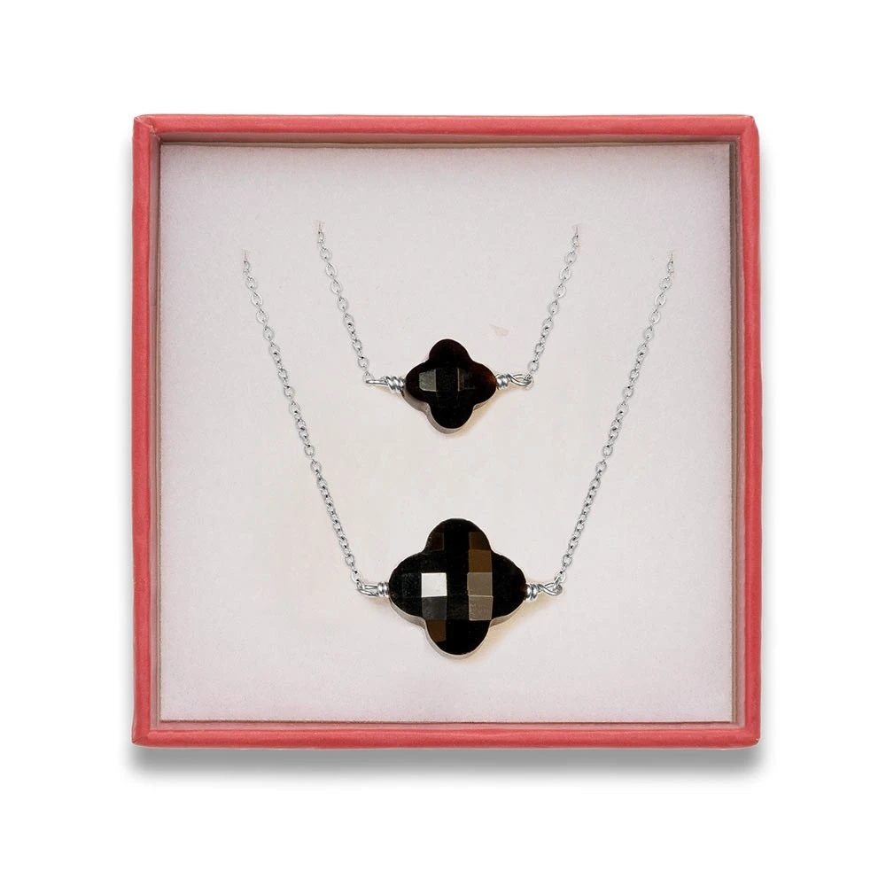 Composition : un bracelet et un collier en argent chacun orné d’un joli trèfle noir.