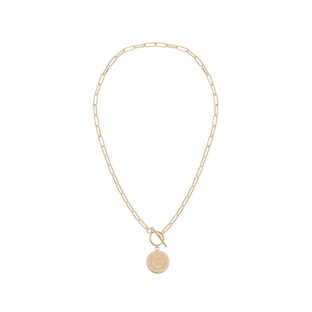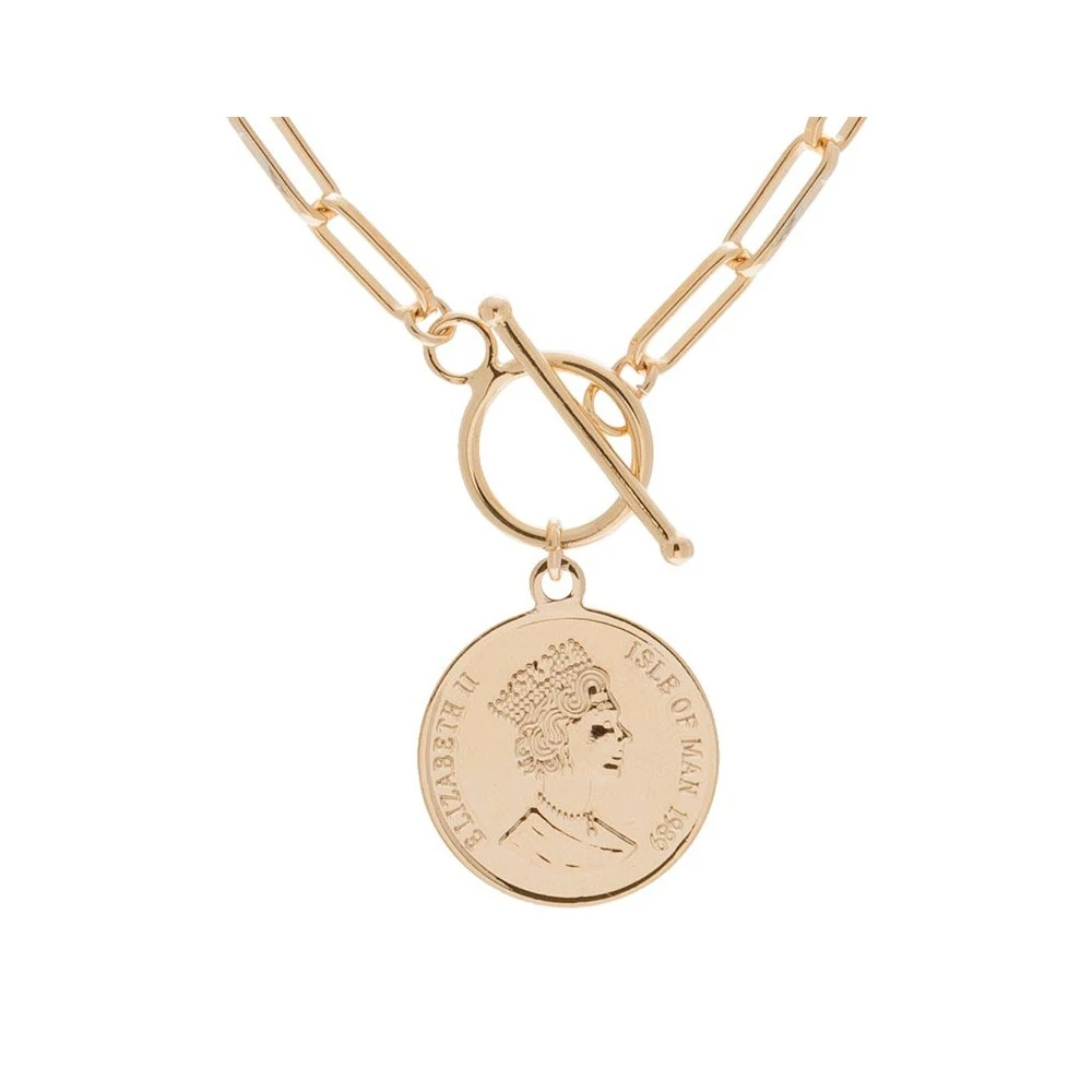 Collier chaîne maillon nacre en plaqué or 3 microns by Jollia. Il se compose d’un pendentif imitation pièce. Sur la première face il est inscrit : 1945 dos pesos, et sur l’autre, la figure d’Elizabeth II isle of man 1989.