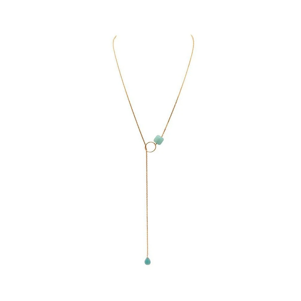Ce collier signé Caroline Najman est une pièce originale à la fois sophistiquée et discrète. Ce bijou qui se porte comme une cravate, est monté sur une fine chaîne en plaqué or avec une pierre fine en forme de goutte au bout (amazonite, bleu). Longueur totale de la chaine: 85 cm, se règle à la hauteur souhaitée.