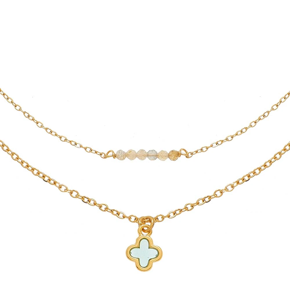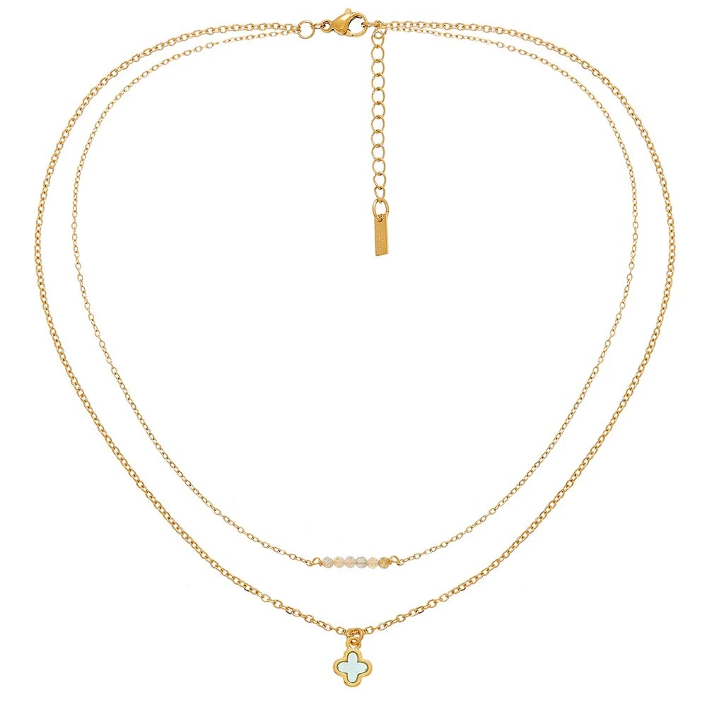 Collier de la crĂ©atrice By Garance, composĂ© de deux chaĂźnes : l’une avec une petite mĂ©daille croix vitrail noire et l’autre avec des petites perles blanches.