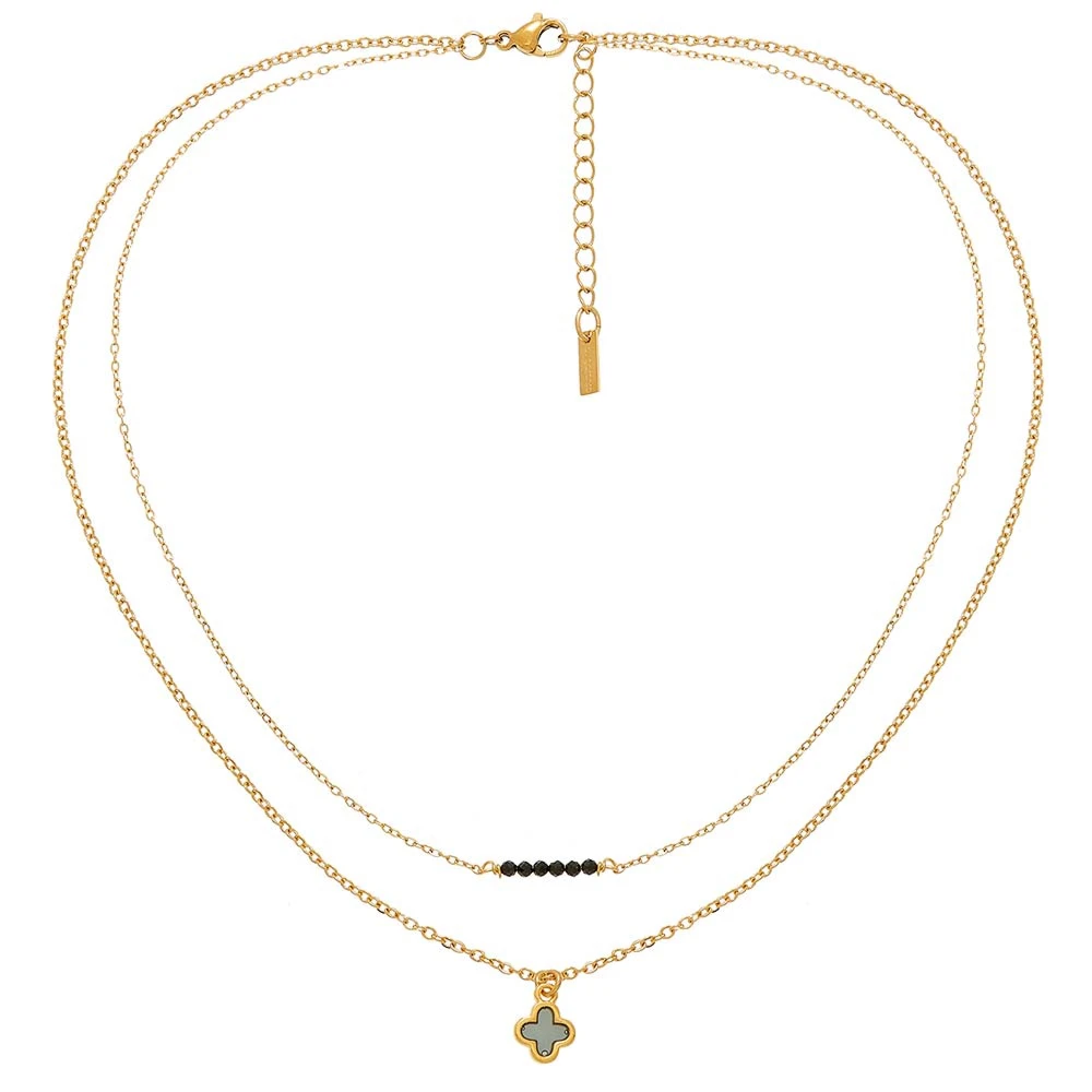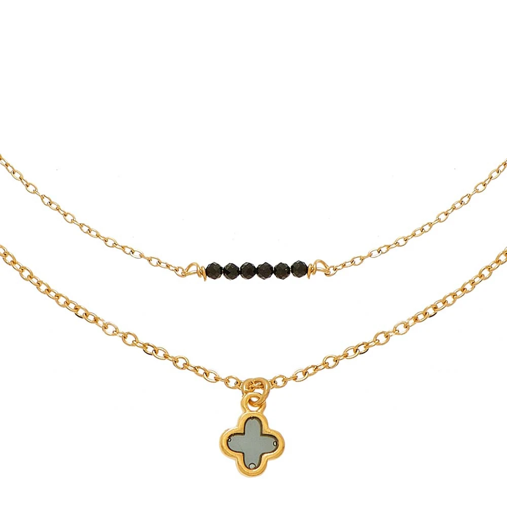 Collier de la créatrice By Garance, composé de deux chaînes : l’une avec une petite médaille croix vitrail noire et l’autre avec des petites perles noires.