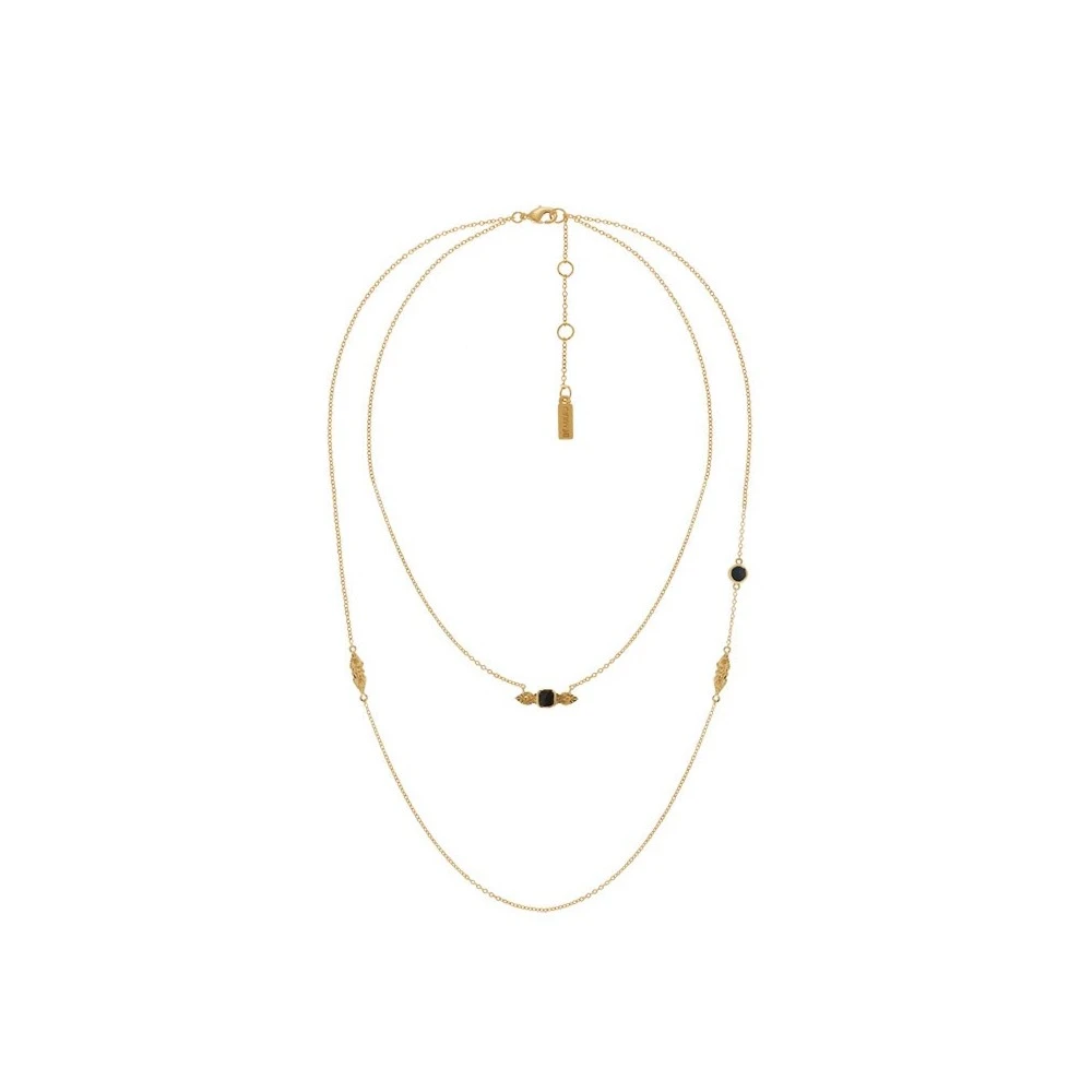 Ce collier de la collection Nati est signé Be Maad. Il est fabriqué à la main en laiton doré à l’or fin 18K et serti de pierres onyx.