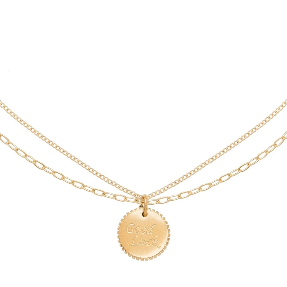 Coller en acier chirurgical trempé dans un bain doré signé Zag Bijoux, se compose d’une double chaîne maillon avec un médaillon Good Luck.