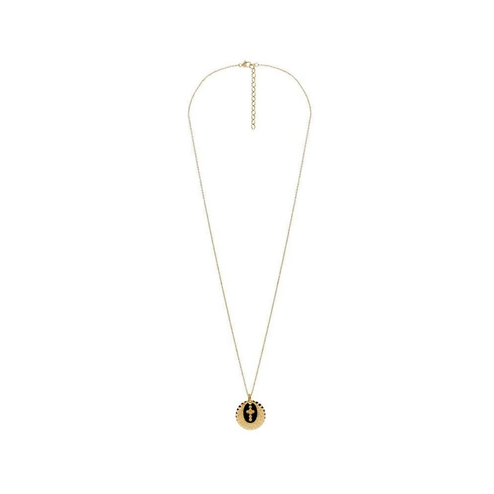 Ce collier est signé Lovely Day, il se compose d’une chaine fine dorée à l’or fin, de deux médailles rondes, elles sont dorées et de tailles différentes, la plus grande est unie texturée, la seconde est ornée d’un motif croix émaillée noire.