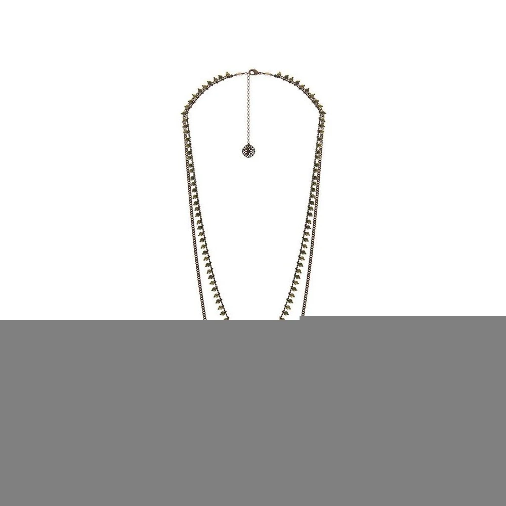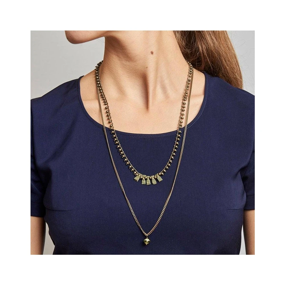 Osez la touche de couleur avec ce collier double rang signé Tungstène. Sa première chaîne est ornée de perles bronze et d’un chemin de franges vertes en cuir et sa seconde est une chaîne plus longue prolongée par un pendentif perle de verre vert d’eau.