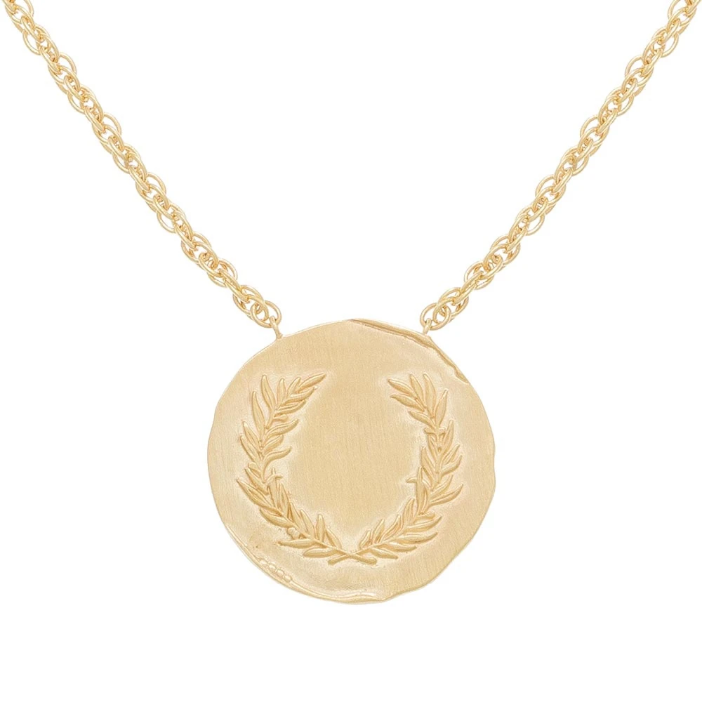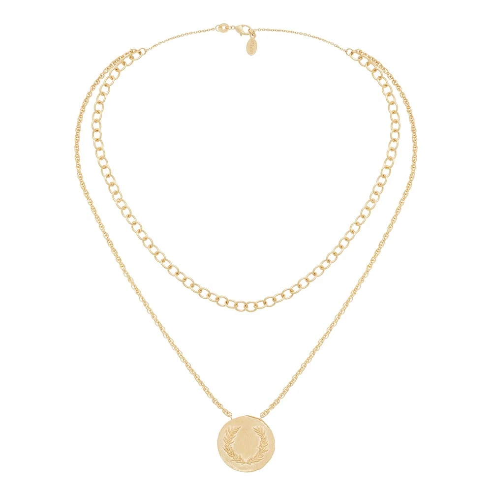 Ce collier est signé Collection Constance, en plaqué or. Il est orné de deux rangs. Le premier est orné d’une chaîne aux maillons plus larges. Le second est orné d’une médaille dorée gravée de branches de lauriers.