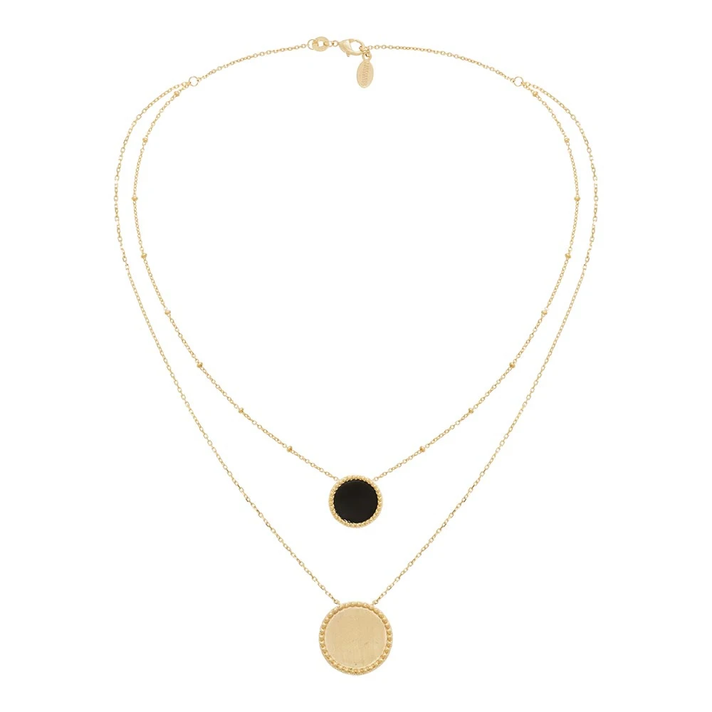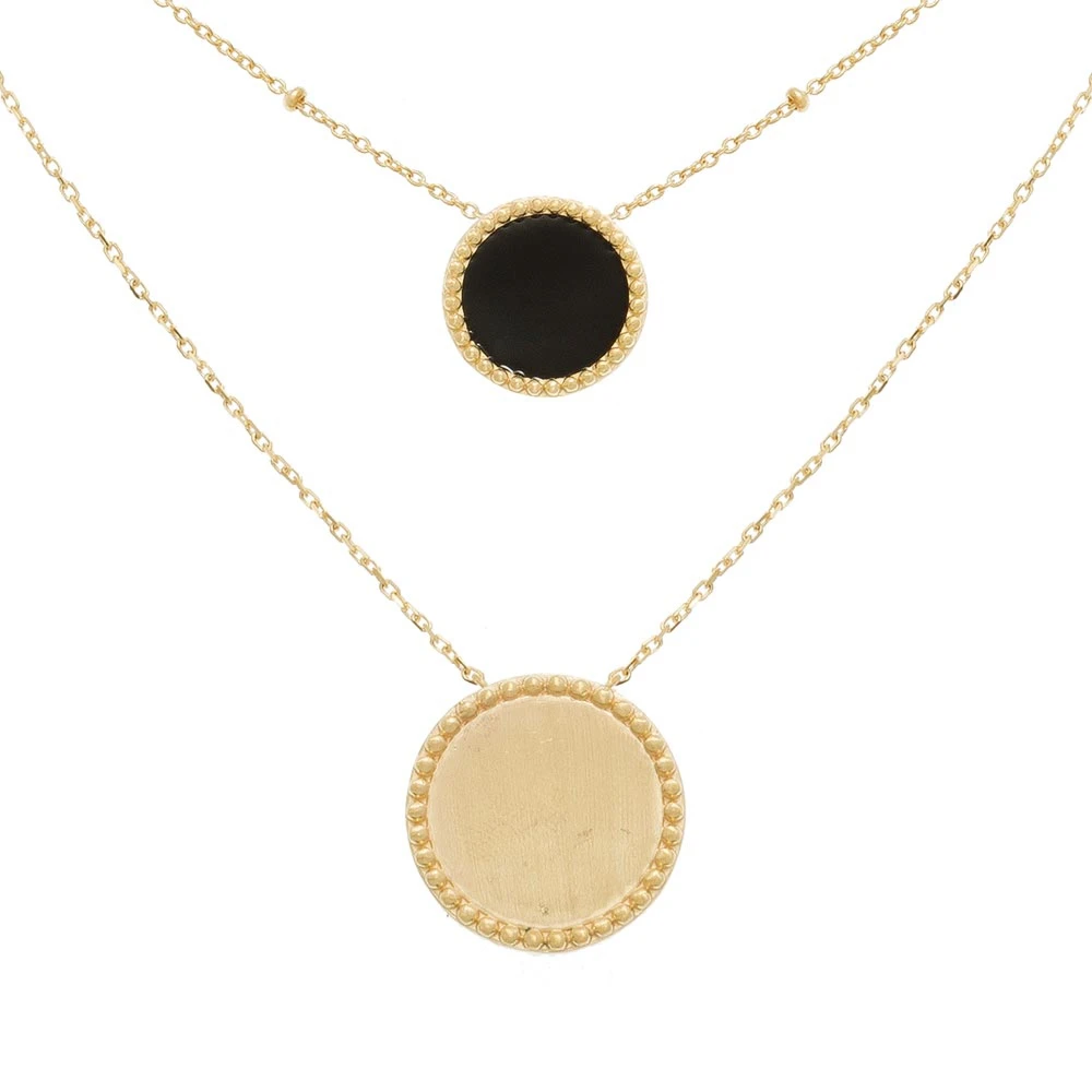 Ce collier est signé Collection Constance, en plaqué or. Il est orné de deux rangs. Le premier est orné d’une petite médaille en émail noir. Le second est orné d’une médaille dorée encerclée de petites billes dorées.