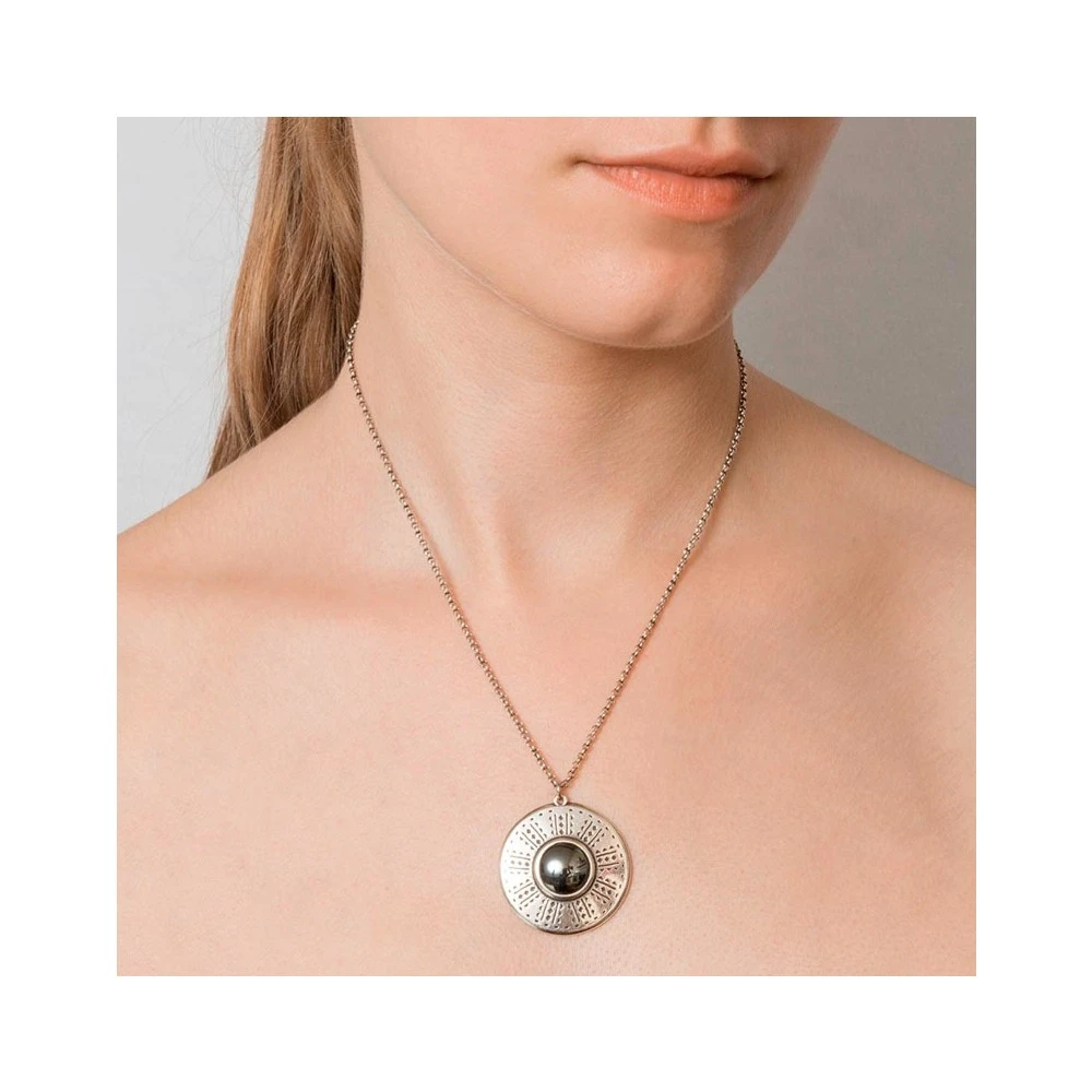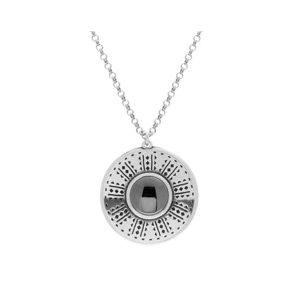 Collier en forme de cercle argenté, composé d’une pierre semi-précieuse en hématite, signé Shabada.