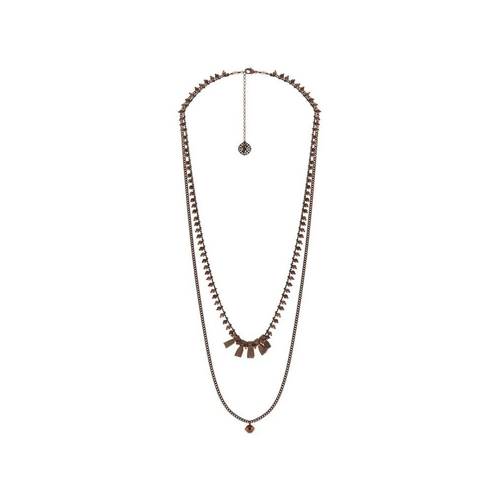 Osez la tendance du cuivre avec ce collier Tungstène. Il se compose de chaînes dont une simple à pendentif perle de verre tchèque facettée et l’autre est sophistiquée par des perles et un centre en franges de cuir taupe.